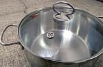 Комбинированная крышка из жаропрочного стекла и нержавеющей стали имеет пароотвод.