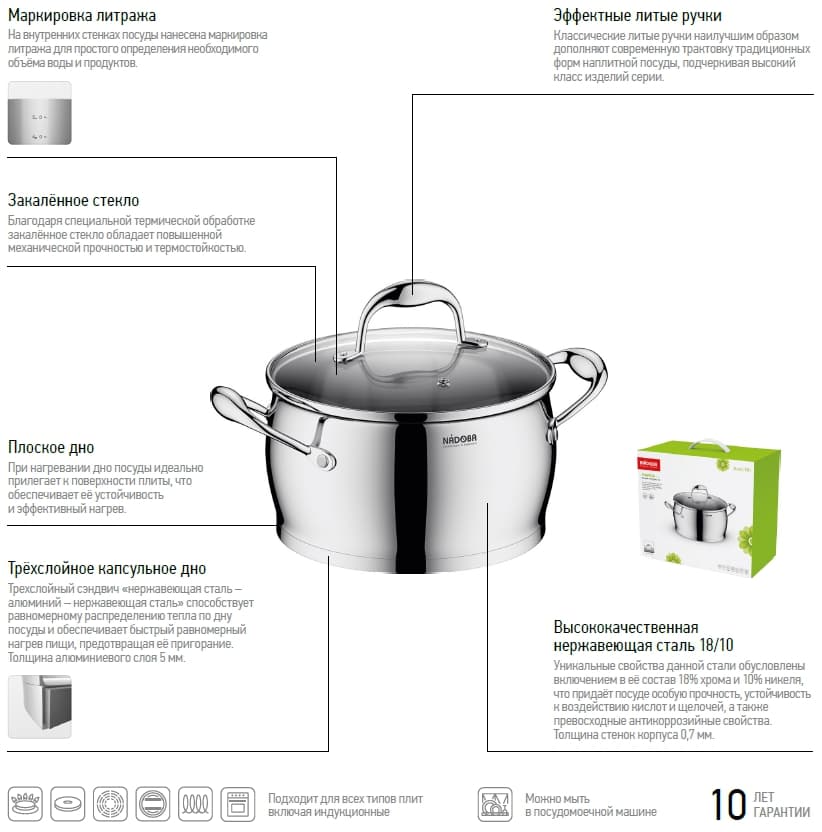 Компания NADOBA использует только экологичные материалы, соответствующие строгим европейским стандартам. Долговечность и надежность продукции подтверждается длительной гарантией. И конечно же - эксклюзивный дизайн посуды не оставит Вас равнодушным!