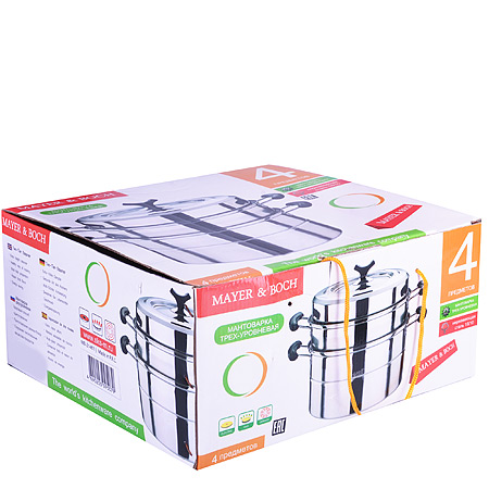 2-х уровневая мантоварка MAYER & BOCH выполнена из высококачественной нержавеющей стали. Мантоварка — это специальная многоуровневая кастрюля с помощью которой можно готовить блюда на пару. Через отверстия в днищах ярусов происходит доступ пара от кипящей воды к приготовляемым продуктам. Идеально подходит для блюд национальной кухни: мант, поз, паровых пельменей и т.п. Кроме этого, на пару можно готовить множество других полезных диетических блюд. Мантоварка оснащена удобными бакелитовыми ручками и стеклянной крышкой, через которую можно наблюдать за процессом готовки. Подходит для всех типов плит. Подходит для мытья в посудомоечной машине.