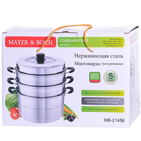 Мантоварка пароварка 3 секции 9,5л/30см MAYER & BOCH нержавеющая сталь со стеклянной крышкой MAYER & BOCH Мантоварки M&B 3-х ярусная мантоварка MAYER & BOCH выполнена из высококачественной нержавеющей стали. Мантоварка — это специальная многоуровневая кастрюля с помощью которой можно готовить блюда на пару. Через отверстия в днищах ярусов происходит доступ пара от кипящей воды к приготовляемым продуктам. Идеально подходит для блюд национальной кухни: мант, поз,