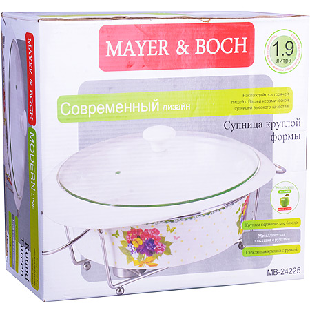 Мармит MAYER & BOCH выполнен из керамики белого цвета, украшенной рисунком. Керамическая чаша с удобными ручками располагается на стальной подставке с двумя подсвечниками для чайных свечей (входят в комплект). Свечи, устанавливающиеся на подставке, нагревают чашу снизу, таким образом поддерживая нужную температуру приготовленного блюда. Стеклянная крышка с удобной ручкой плотно прикрывает чашу сверху, в свою очередь также не давая остыть блюду. Благодаря своему элегантному дизайну, мармит с приготовленным блюдом можно сразу подавать на стол, не перекладывая еду на сервировочные тарелки. Изящный, с современным дизайном, мармит украсит любой праздничный стол, а блюда в нем будут всегда теплыми и ароматными. Керамическая чаша (без подставки) подходит для использования в духовом шкафу и микроволновой печи. Подходит для мытья в посудомоечной машине. Подходит для хранения в холодильнике.