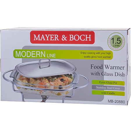 Мармит MAYER & BOCH выполнен из стекла и нержавеющей стали. Стеклянная чаша располагается на стальной подставке с подсвечником для чайной свечи, снабженной двумя ручками. Свеча, устанавливающаяся на подставке, нагревает чашу снизу, таким образом поддерживая нужную температуру приготовленного блюда. Крышка из качественной нержавеющей стали с удобной ручкой плотно прикрывает чашу сверху, в свою очередь также не давая остыть блюду. Благодаря своему элегантному дизайну, мармит с приготовленным блюдом можно сразу подавать на стол, не перекладывая еду на сервировочные тарелки. Изящный, с современным дизайном, мармит украсит любой праздничный стол, а блюда в нем будут всегда теплыми и ароматными. Стеклянная чаша (без крышки и подставки) подходит для использования в духовом шкафу и микроволновой печи. Подходит для мытья в посудомоечной машине. Подходит для хранения в холодильнике.