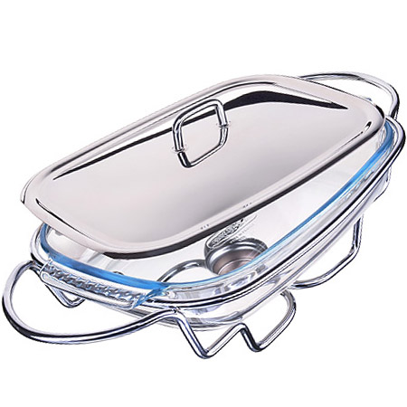 Мармит MAYER & BOCH выполнен из стекла и нержавеющей стали. Стеклянная чаша располагается на стальной подставке с подсвечником для чайной свечи, снабженной двумя ручками. Свеча, устанавливающаяся на подставке, нагревает чашу снизу, таким образом поддерживая нужную температуру приготовленного блюда. Крышка из качественной нержавеющей стали с