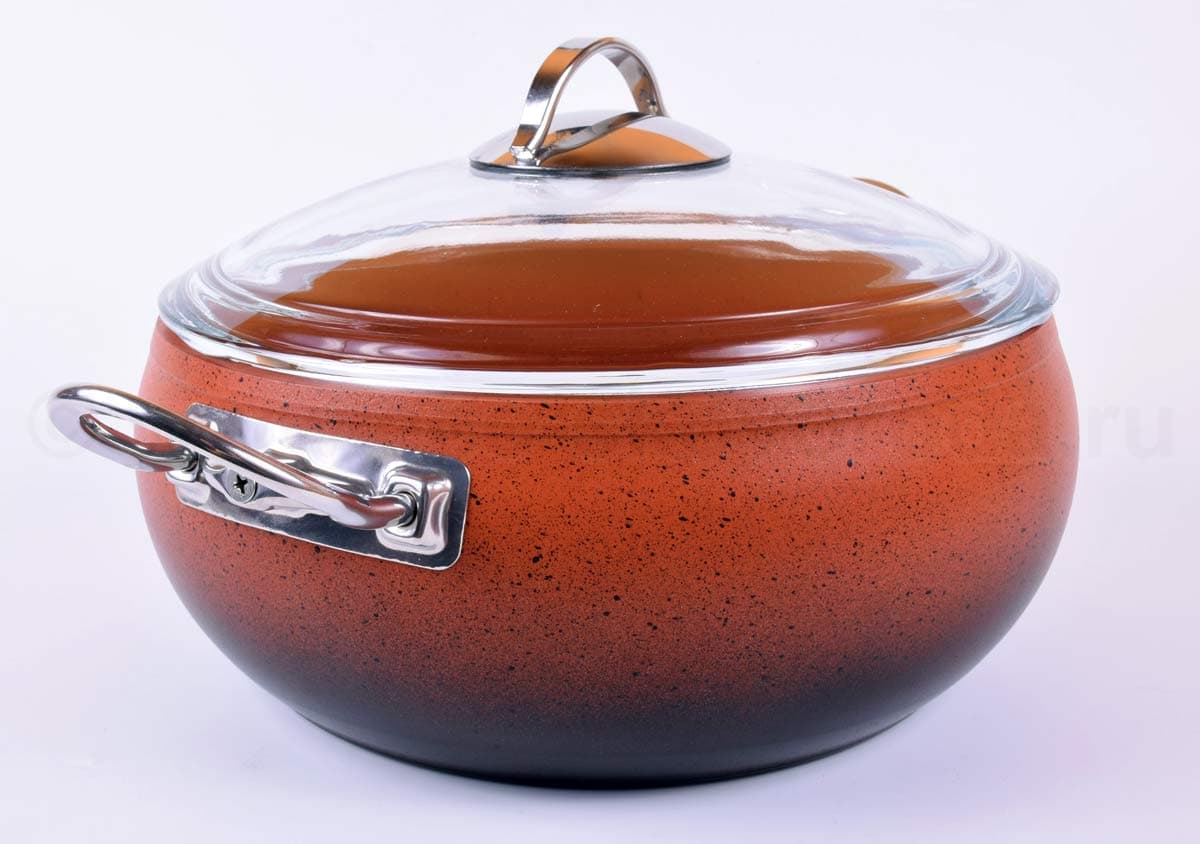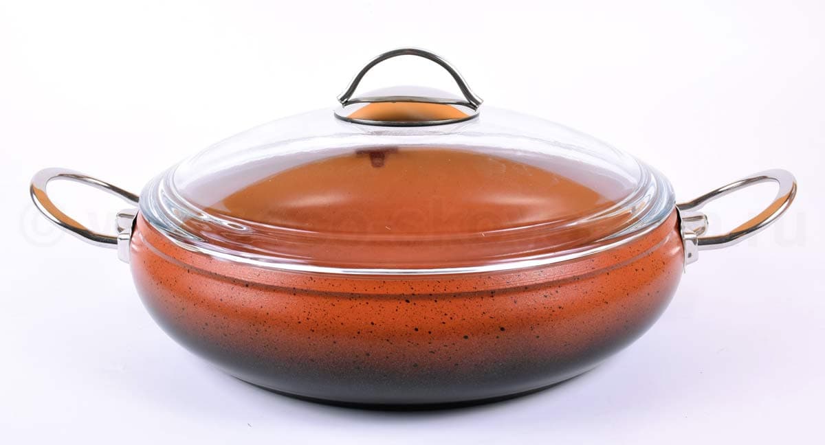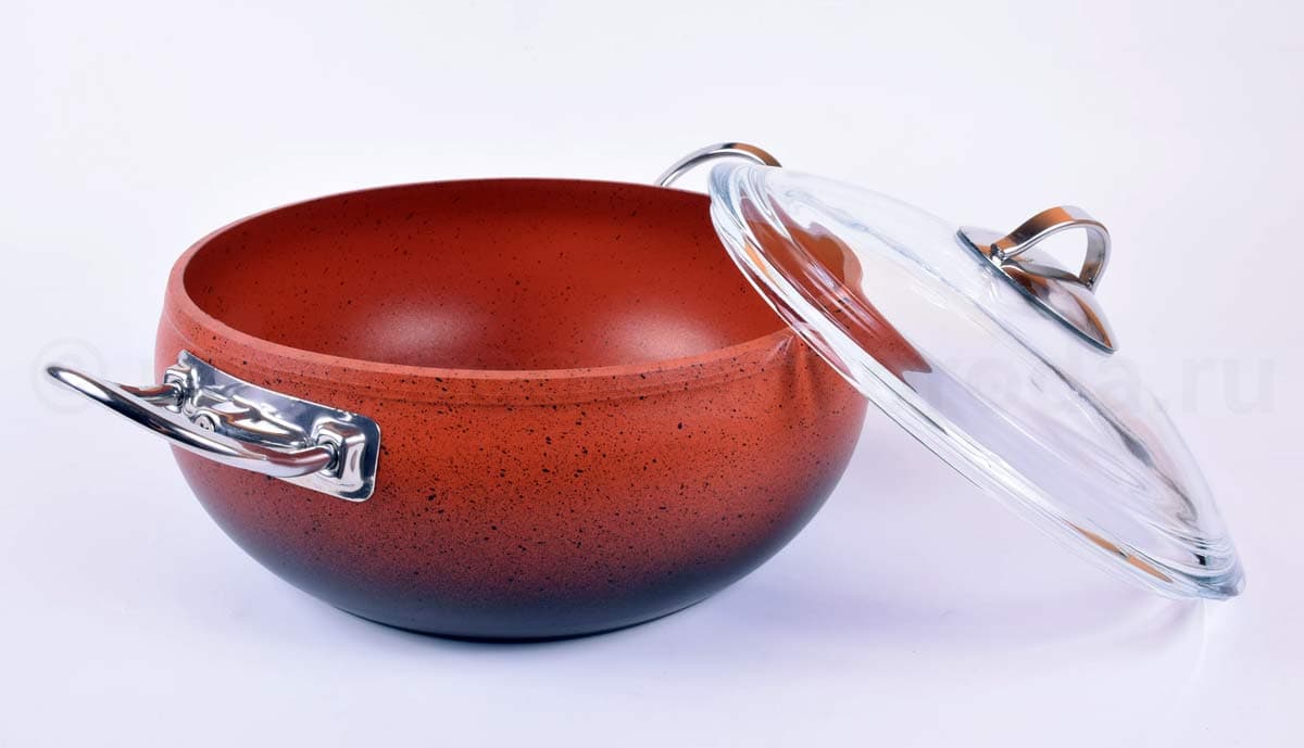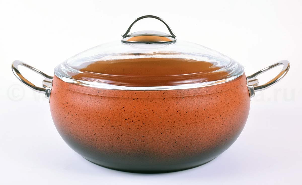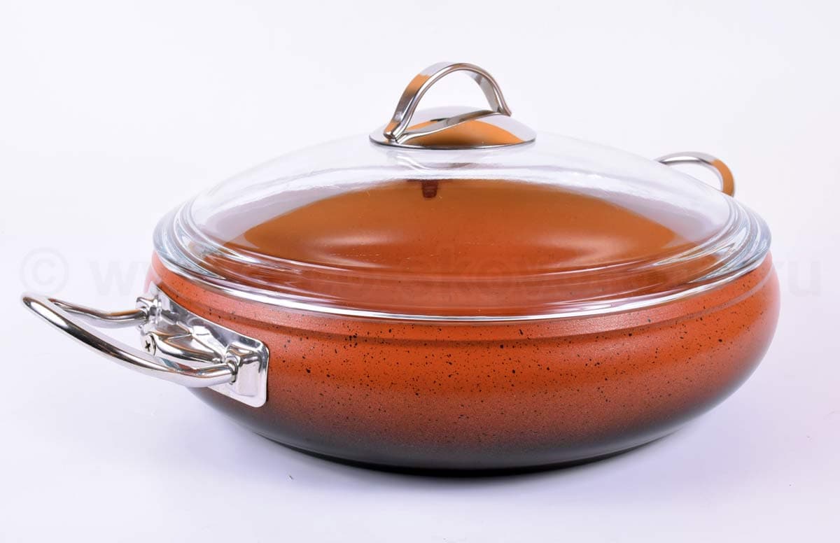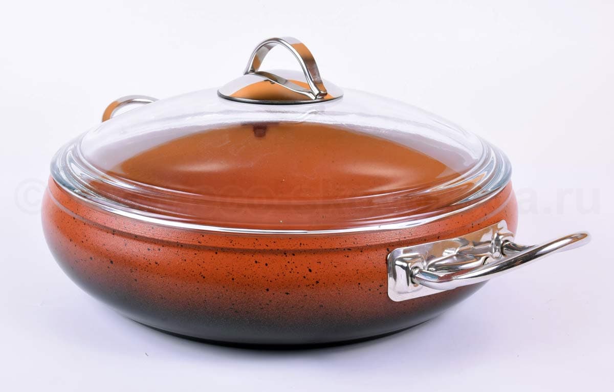 Подходит для всех видов плит, кроме индукции. При приготовлении пищи рекомендуется использовать деревянные и пластиковые кухонные инструменты. При уходе за посудой использовать мягкие моющие средства.