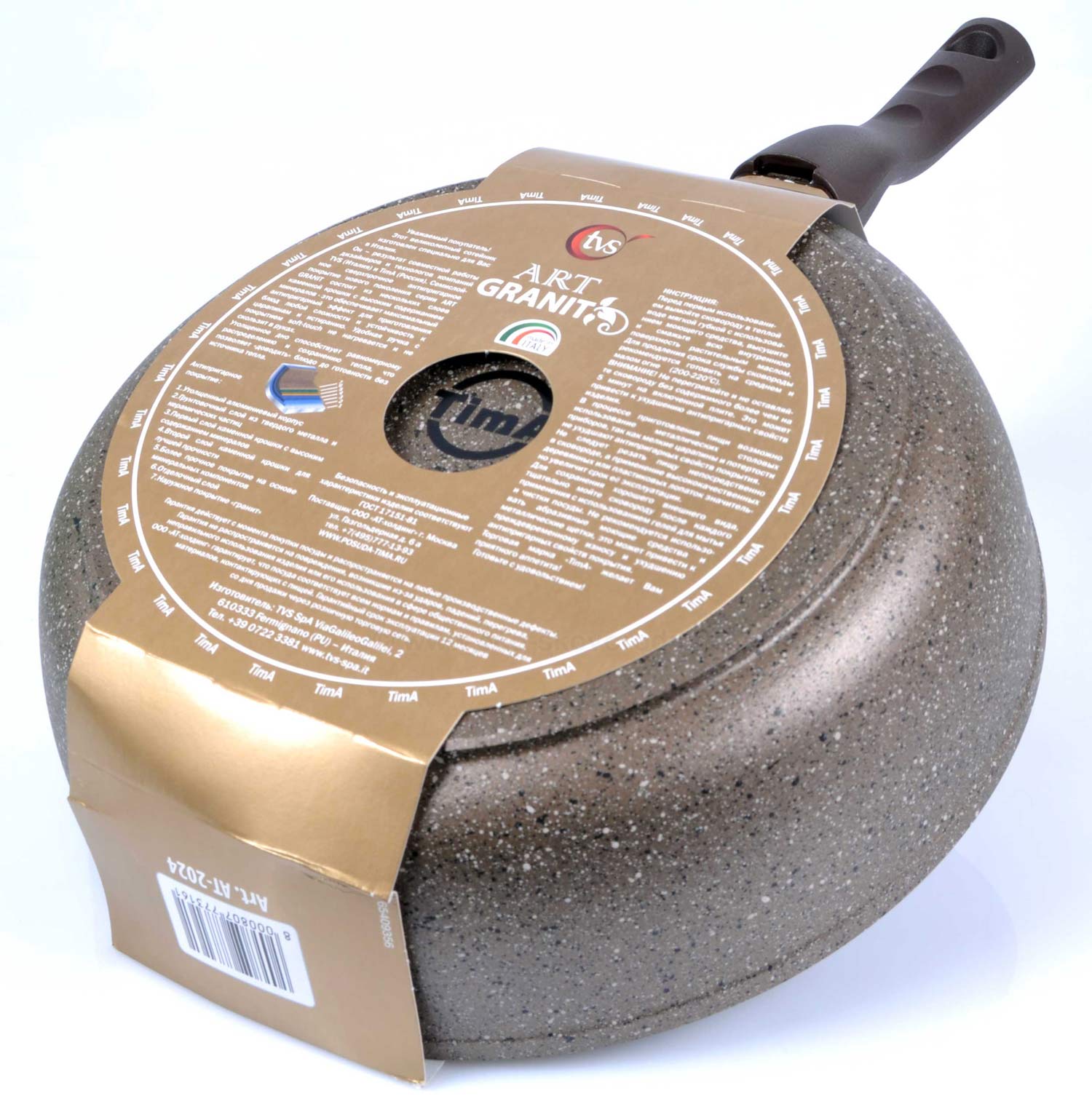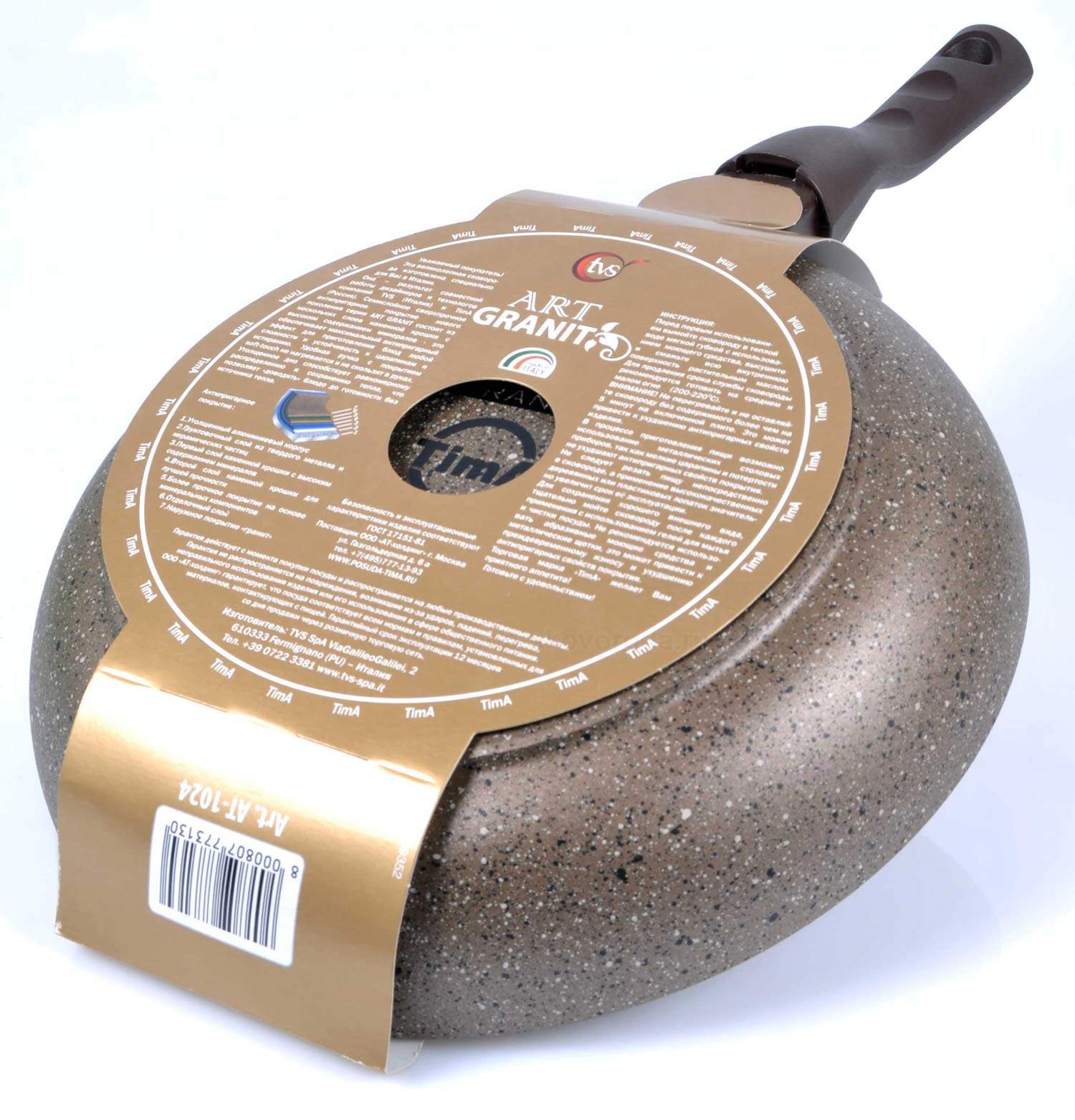 Товар произведён фирмой TVS на заводе в Италии по заказу Российской компании "ТимА". В связи с этим на упаковке товара логотип фирмы TVS, на дне посуды логотип компании "ТимА" и надпись Made in Italy.
