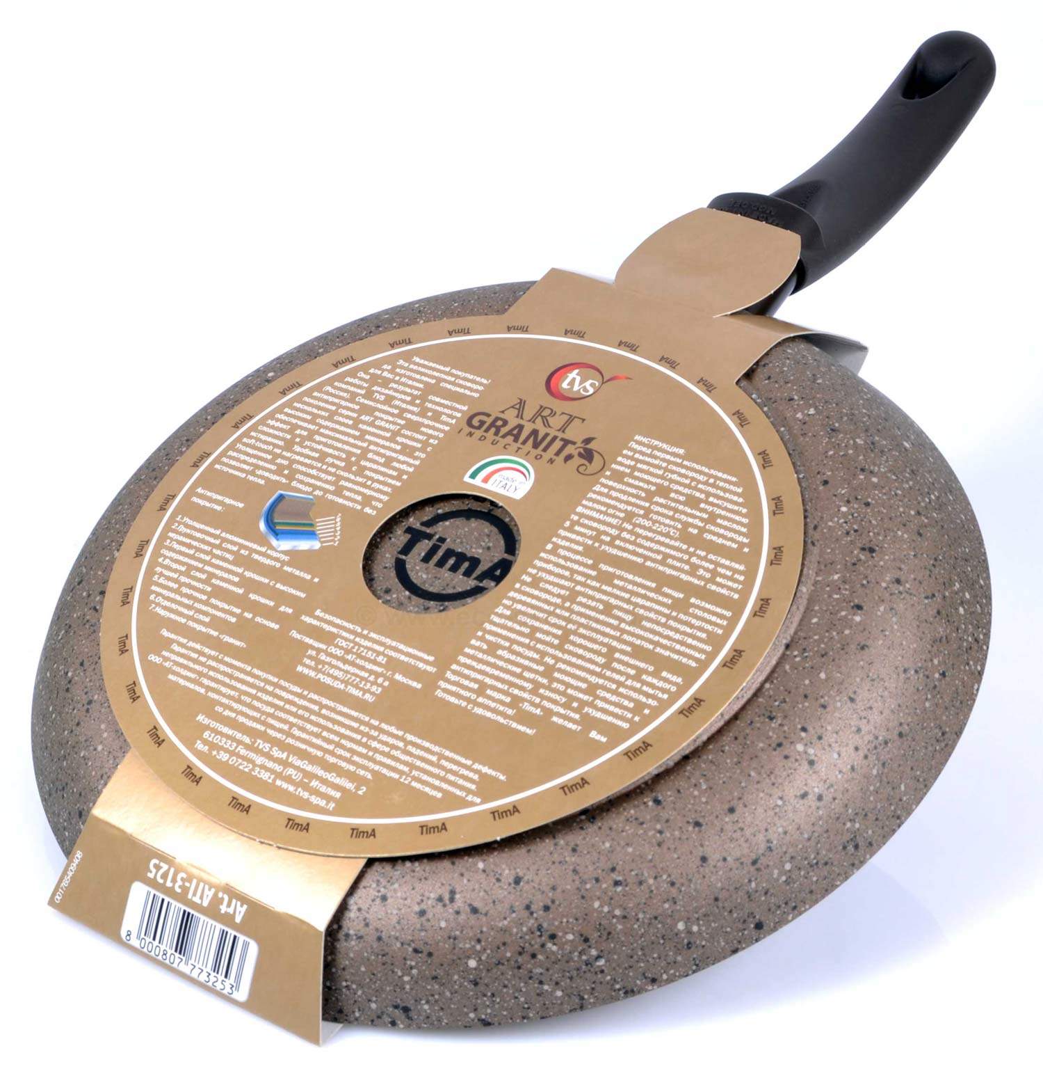 Поэтому на упаковке товара указаны бренды TVS и Tima, а на сковороде бренд Tima и надпись - Сделано в Италии.