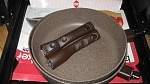 Форма ручки прекрасно лежит как в мужской ладони среднего размера, так и в маленькой женской ладошке. Не проворачивается даже в мокрой руке. Фиксируется плотно и цепко даже в руке, выпачканной жиром.