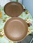 На мой не совсем искушенный взгляд, каменное покрытие сковород чуть лучше защищает их от механических повреждений, вызванных приготовлением пищи в целом и механических царапин, в частности. Не всегда и не все достаточно аккуратны, чтобы использовать пластмассовые, деревянные или силиконовые лопатки (я уже не говорю о том, что воровать жареную картошку у жены на кухне можно только железной вилкой).