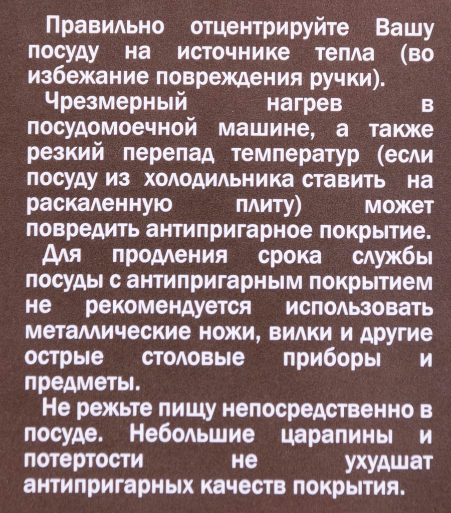 Для продления срока службы посуды с антипригарным покрытием не рекомендуется использовать металлические ножи, вилки и другие острые столовые приборы и предметы.