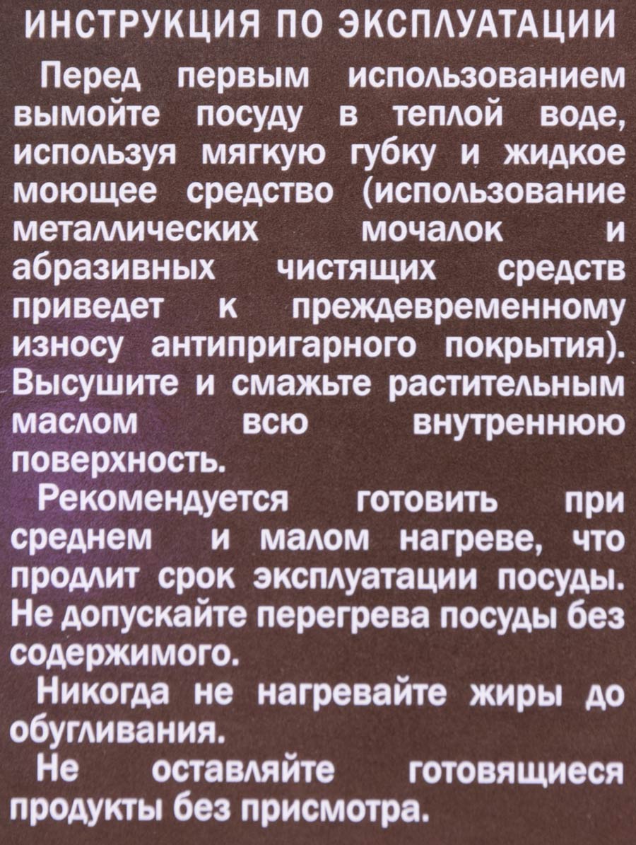 Рекомендуется готовить при среднем и малом нагреве, что продлит срок эксплуатации посуды. Не допускайте перегрева посуды без содержимого.