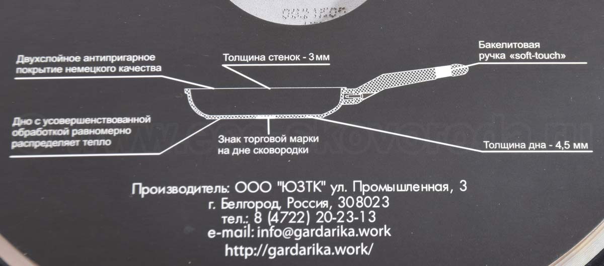 При производстве посуды ГАРДАРИКА применяется немецкое антипригарное покрытие Greblon C2+ на основе PTFE.
