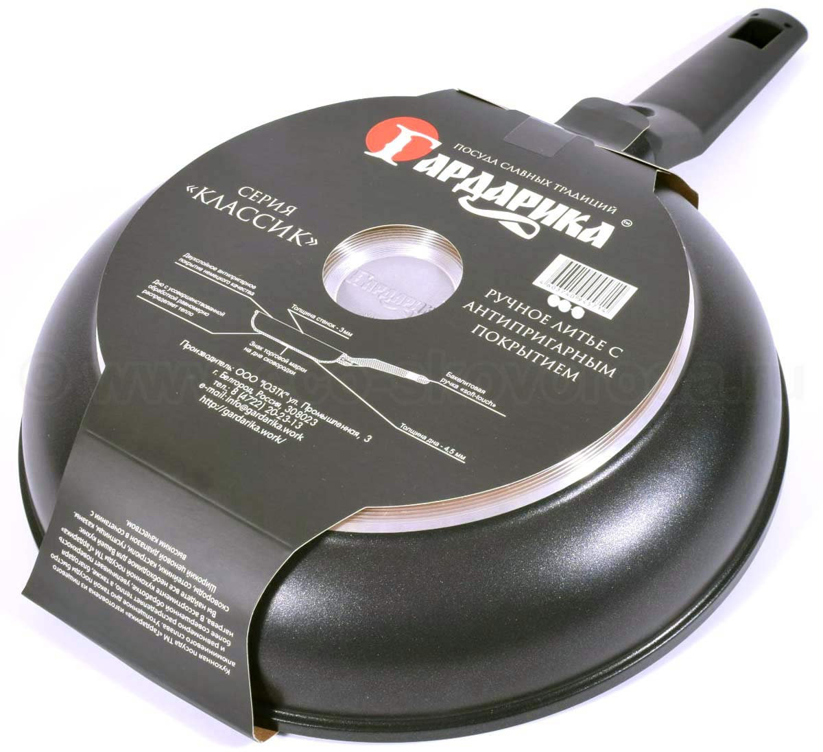 Сковорода для жарки ГАРДАРИКА Классик с антипригарным покрытием. Подходит ко всем плитам, кроме индукционных. Можно использовать в посудомоечной машине. Произведена сковорода в России и имеет гарантию 1 год.