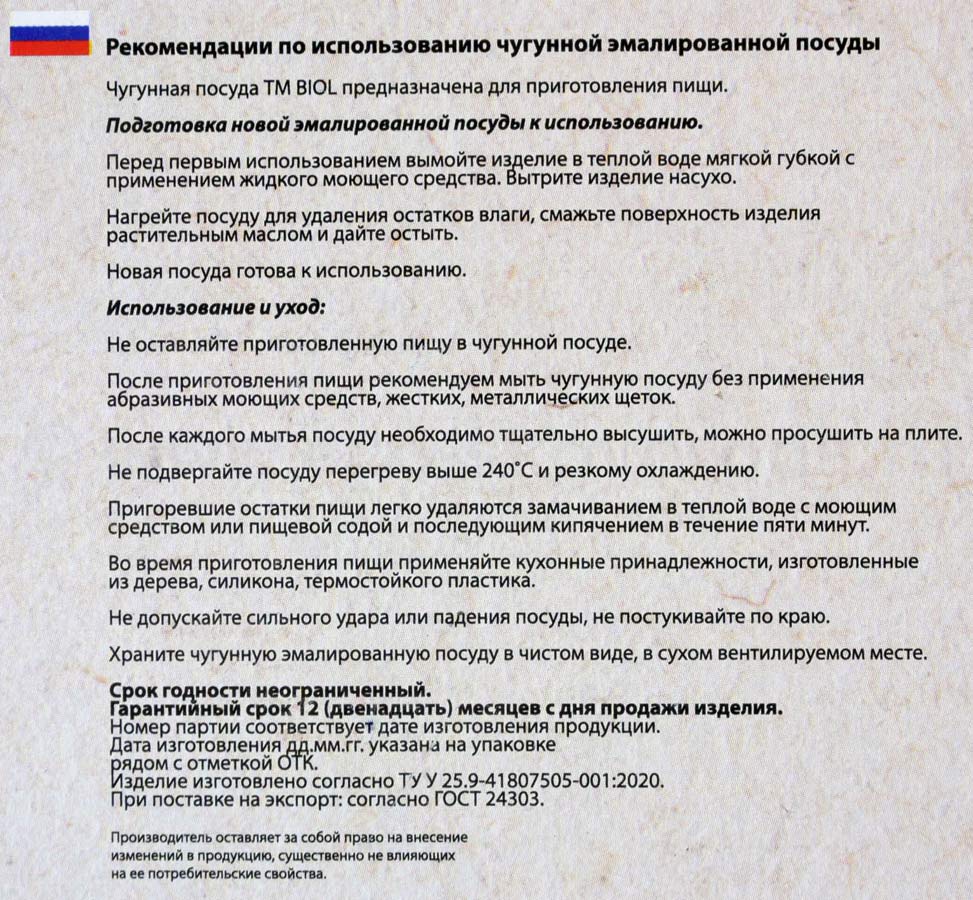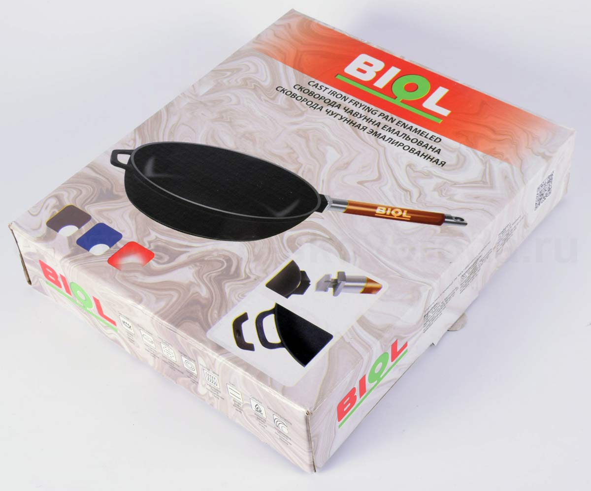Сковорода 24см чугунная БИОЛ с эмалированным покрытием, съемная ручка, синяя, Украина Биол Эмаль Подготовка новой эмалированной посуды к использованию Чтобы посуда из чугуна прослужила десятилетия, ее нужно надлежащим образом подготовить к эксплуатации. Перед первым использованием вымойте изделие в теплой воде мягкой губкой с применением жидкого моющего средства. Вытрите изделие насухо. Нагрейте посуду для удаления остатков