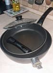 - Лучше немного подождать, пока сковорода остынет. Термошок может отрицательно сказаться на сроке ее службы.