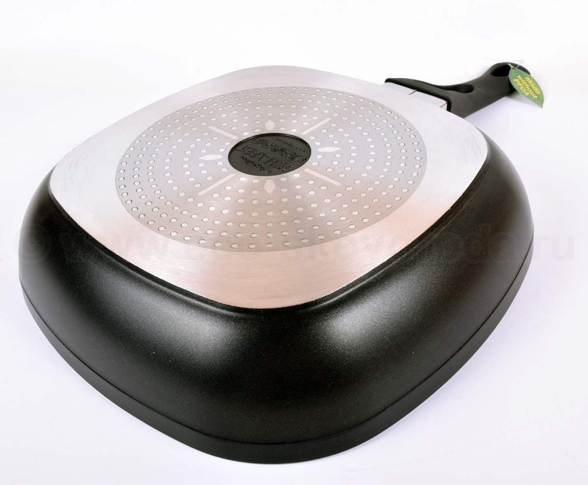 При приготовлении пищи можно использовать неострые металлические инструменты. Массивный корпус из литого алюминия обеспечивает равномерный нагрев всей поверхности посуды и не деформируется при нагревании.