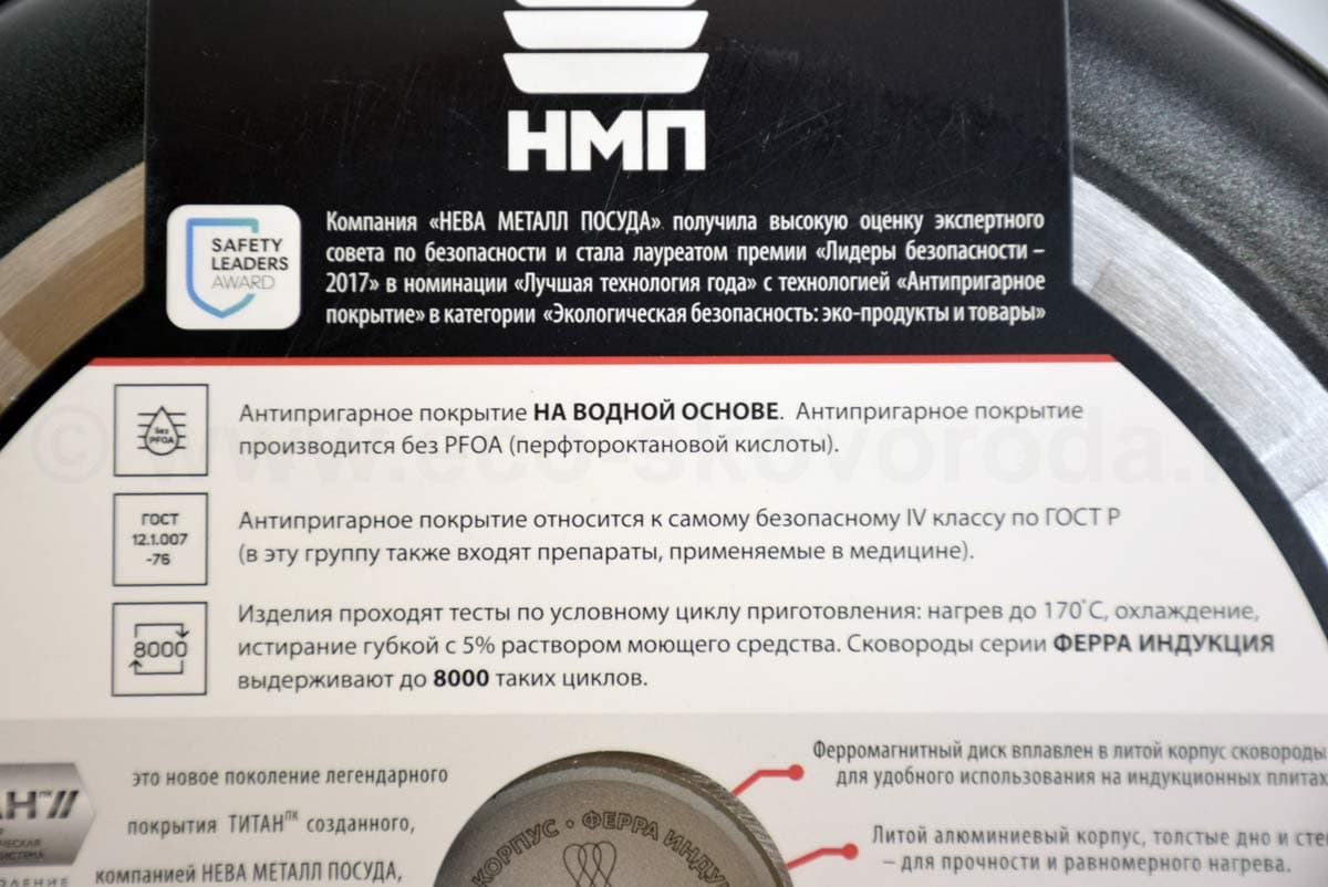 Компания НЕВА МЕТАЛЛ ПОСУДА при производстве своих изделий использует только самые качественные и безвредные материалы. Уже более 10 лет компания совершенствует и накапливает опыт в производстве посуды с антипригарным покрытием. Антипригарное покрытие на водной основе, используемое при производстве посуды, относится к наиболее безопасному, IV классу по ГОСТу 12.1.007-76. В этот класс так же входят вещества, используемые в медицине.