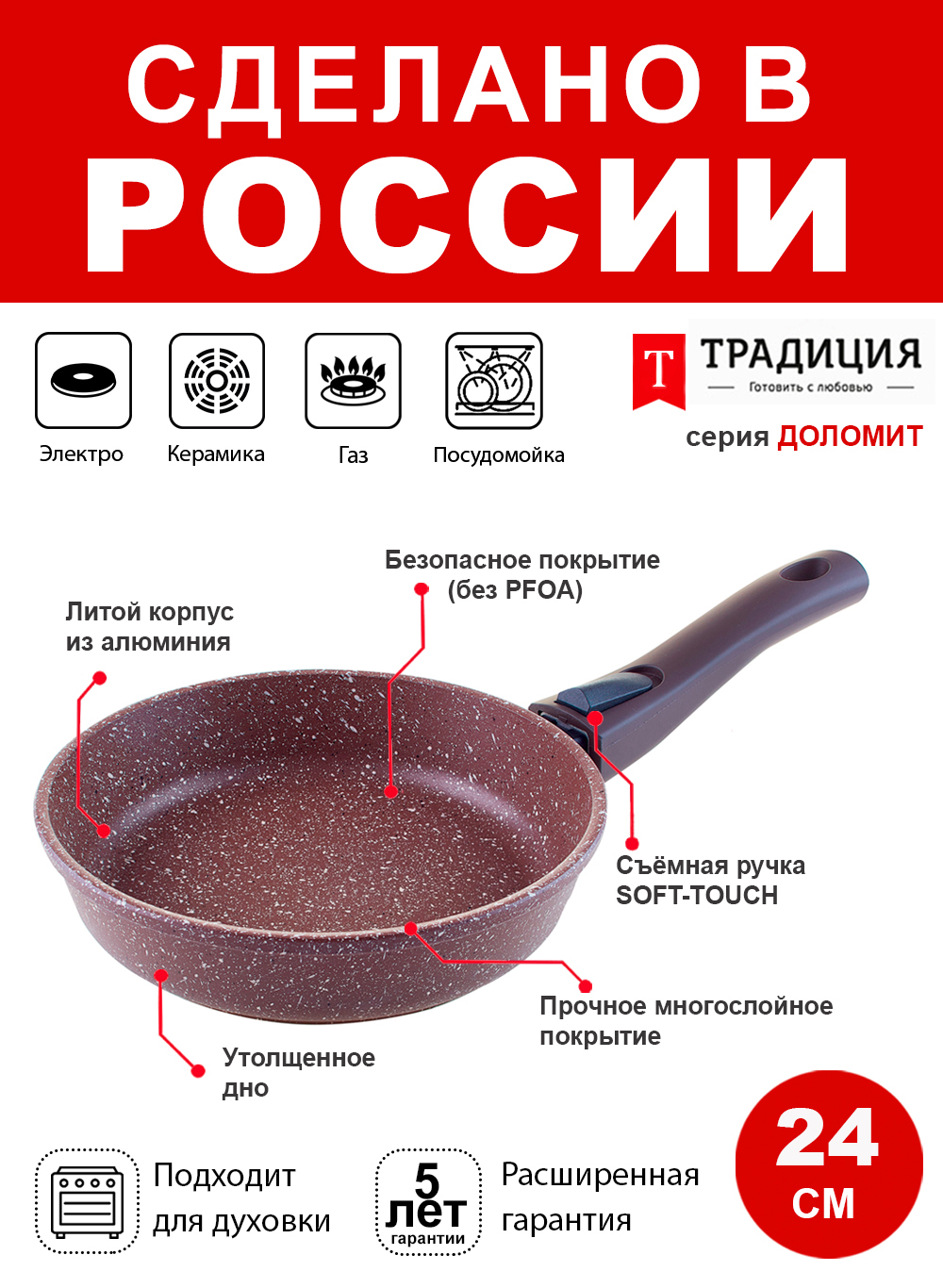 Серия Доломит представлена сковородами с прочным литым корпусом и каменным покрытием, произведена российской торговой маркой посуды Традиция. Все товары данной серии производятся в России в соответствии с ГОСТами.