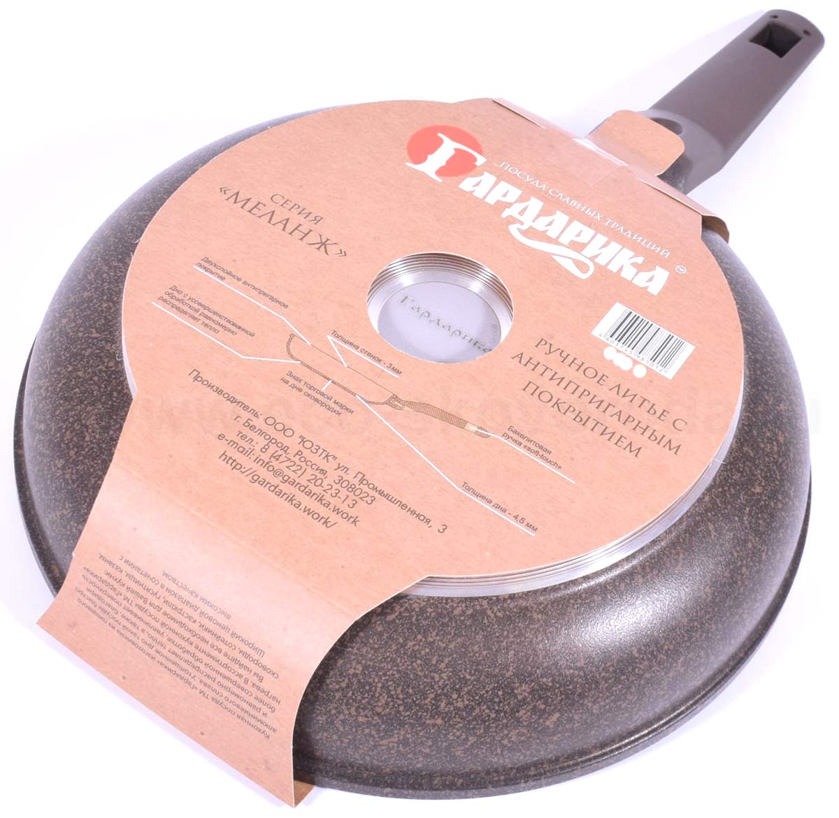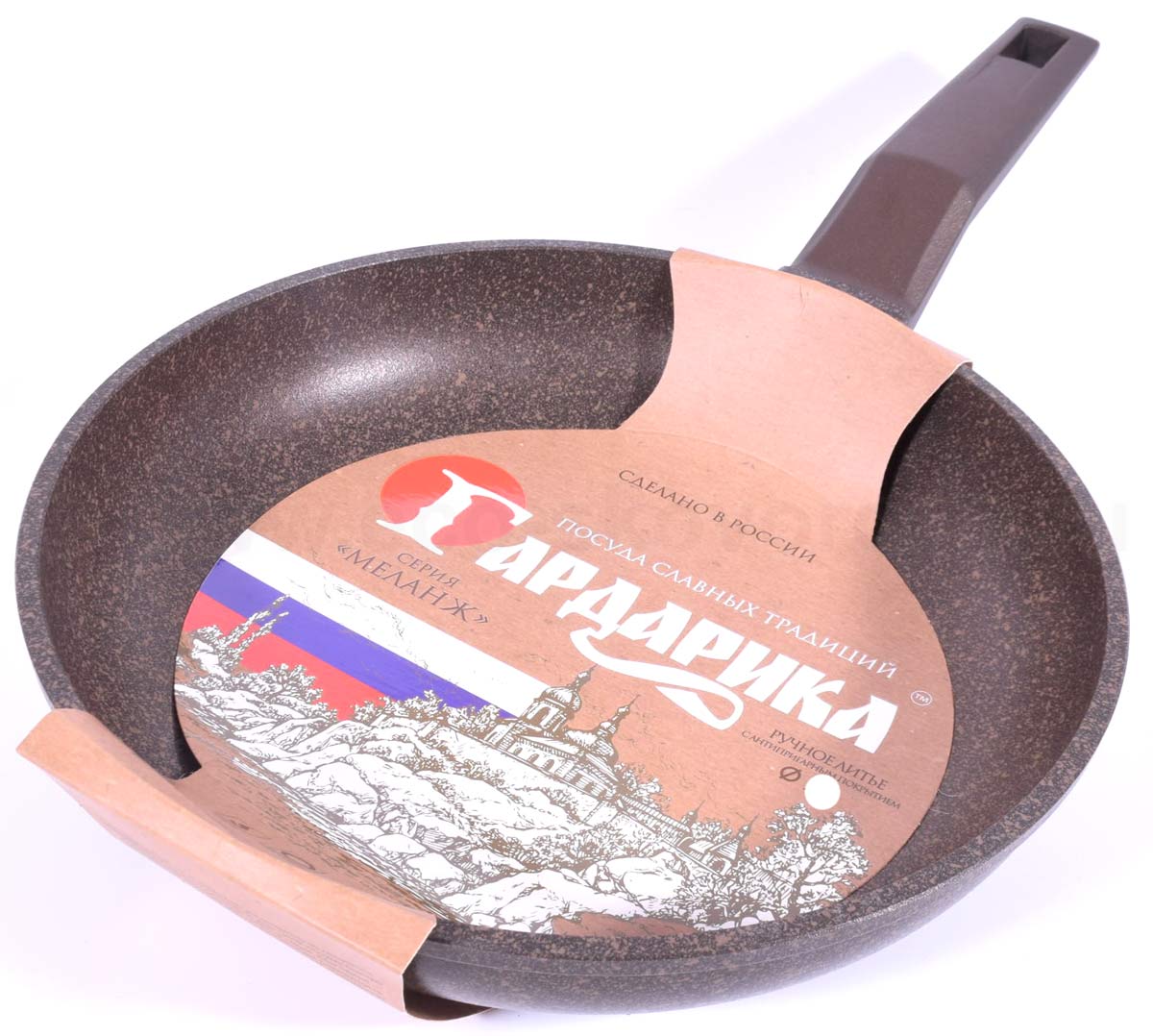 Сковорода 26см ГАРДАРИКА Меланж с ручкой Soft-touch, Россия Гардарика Меланж Сковорода для жарки ГАРДАРИКА Меланж с антипригарным покрытием. Подходит ко всем плитам, кроме индукционных. Можно использовать в посудомоечной машине. Произведена сковорода в России и имеет гарантию 1 год. Внешний вид сковороды ГАРДАРИКА Меланж: Внутри и снаружи имеет коричневый оттенок с текстурой каменной крошки; Толщина