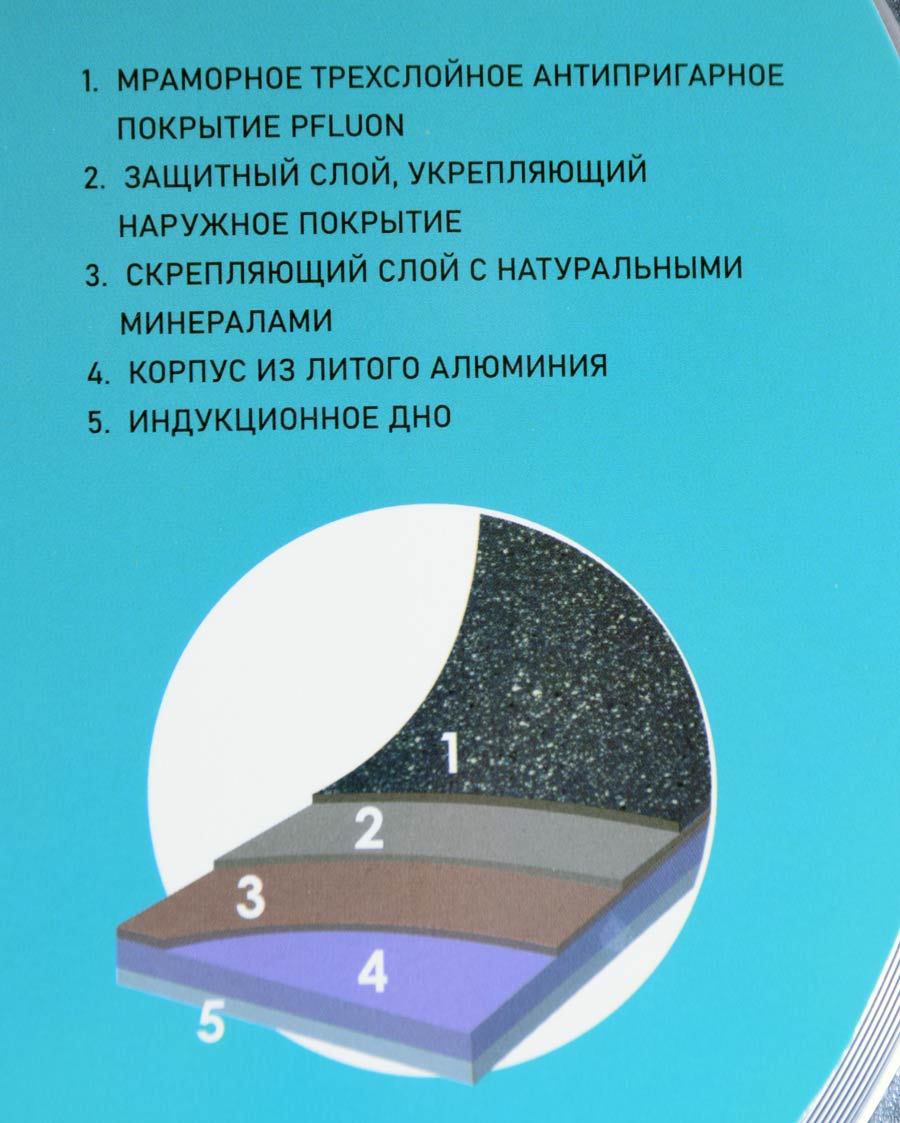Высококачественное трехслойное антипригарное покрытие PFLUON на основе структуры гранита усилено сверхпрочными минералами и усовершенствованно за счет микро-рельефной поверхности, которая усиливает антипригарные свойства посуды. Наносится методом напыления в несколько слоев.