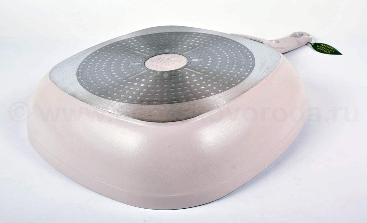 При приготовлении пищи можно использовать неострые металлические инструменты. Массивный корпус из литого алюминия обеспечивает равномерный нагрев всей поверхности посуды и не деформируется при нагревании.