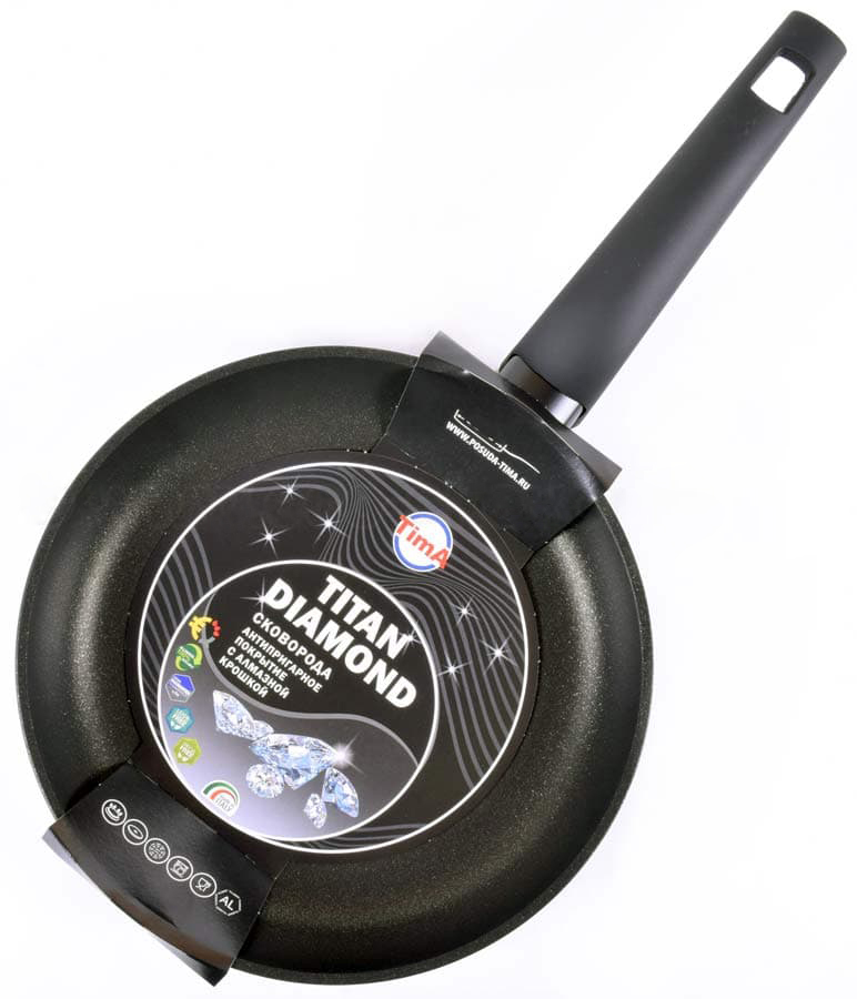 Сковорода 26см TIMA/TVS Titan Diamond с титановым покрытием Diamantek, Италия Tima Titan Diamond TIMA TITAN DIAMOND — это новая серия экологичной итальянской посуды с титановым антипригарным покрытием, которая пришла на замену уже всем полюбившейся TIMA TITAN GRANIT. В отличие от предыдущей серии, серия TITAN DIAMOND также выполнена из прочного кованного алюминия, но дополнительно получила алмазное напыление, что придаёт