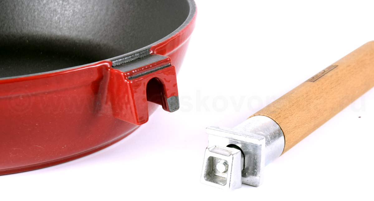 Надежная система крепления деревянной ручки позволяет использовать и без того тяжелую чугунную посуду не опасаясь, что ручка подведет в самый не подходящий момент. Кроме того, при условии снятой ручки посуду можно использовать в духовом шкафу или просто компактно ее хранить.
