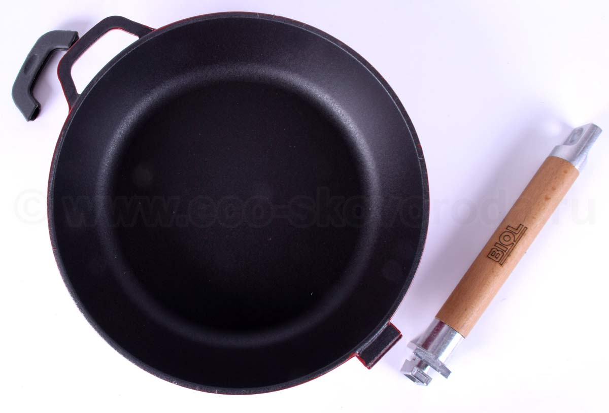 Сковорода 28см чугунная БИОЛ с эмалированным покрытием, съемная ручка, красная, Украина Биол Эмаль Подготовка новой эмалированной посуды к использованию Чтобы посуда из чугуна прослужила десятилетия, ее нужно надлежащим образом подготовить к эксплуатации. Перед первым использованием вымойте изделие в теплой воде мягкой губкой с применением жидкого моющего средства. Вытрите изделие насухо. Нагрейте посуду для удаления остатков