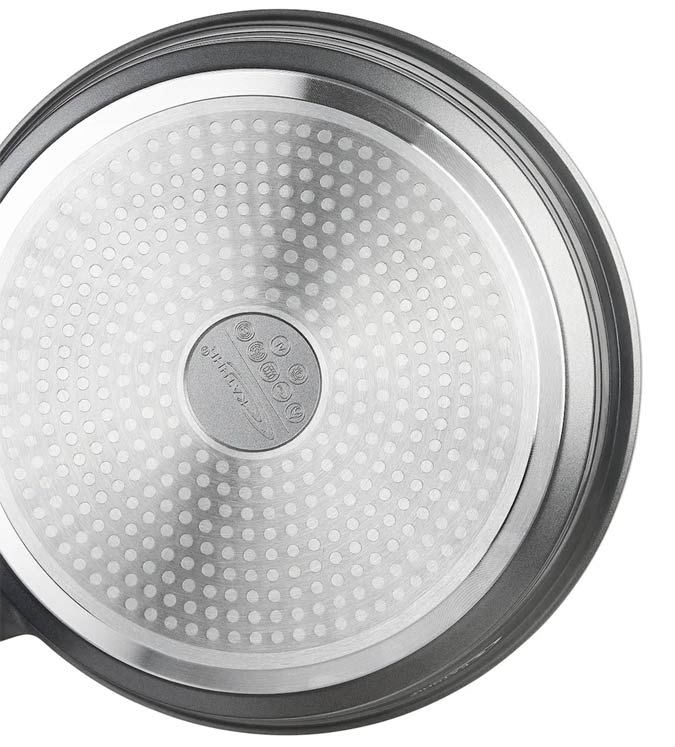 Высококачественное трехслойное антипригарное покрытие PFLUON на основе структуры гранита усилено сверхпрочными минералами и усовершенствованно за счет микро-рельефной поверхности, которая усиливает антипригарные свойства посуды. Наносится методом напыления в несколько слоев.