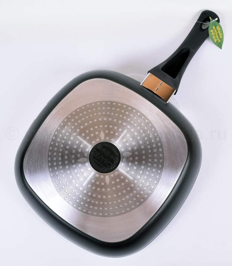При приготовлении пищи можно использовать неострые металлические инструменты. Массивный корпус из литого алюминия обеспечивает равномерный нагрев всей поверхности посуды и не деформируется при нагревании.