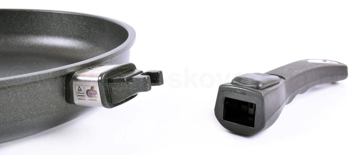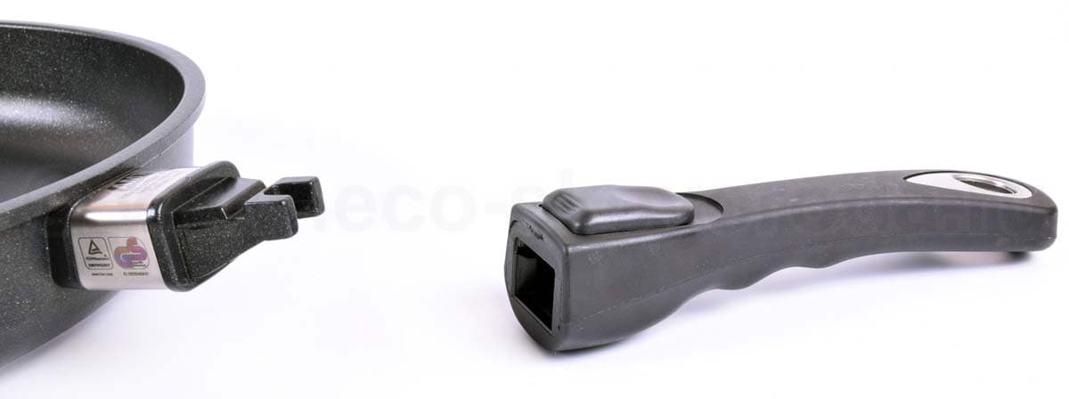 Съемная ручка позволяет экономить место при хранении, размещать посуду в углу шкафа, холодильнике или даже в самых маленьких посудомоечных машинах (должна быть спец. маркировка!).