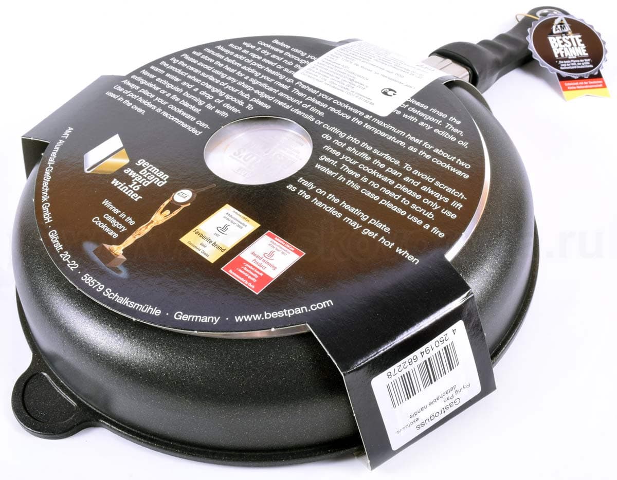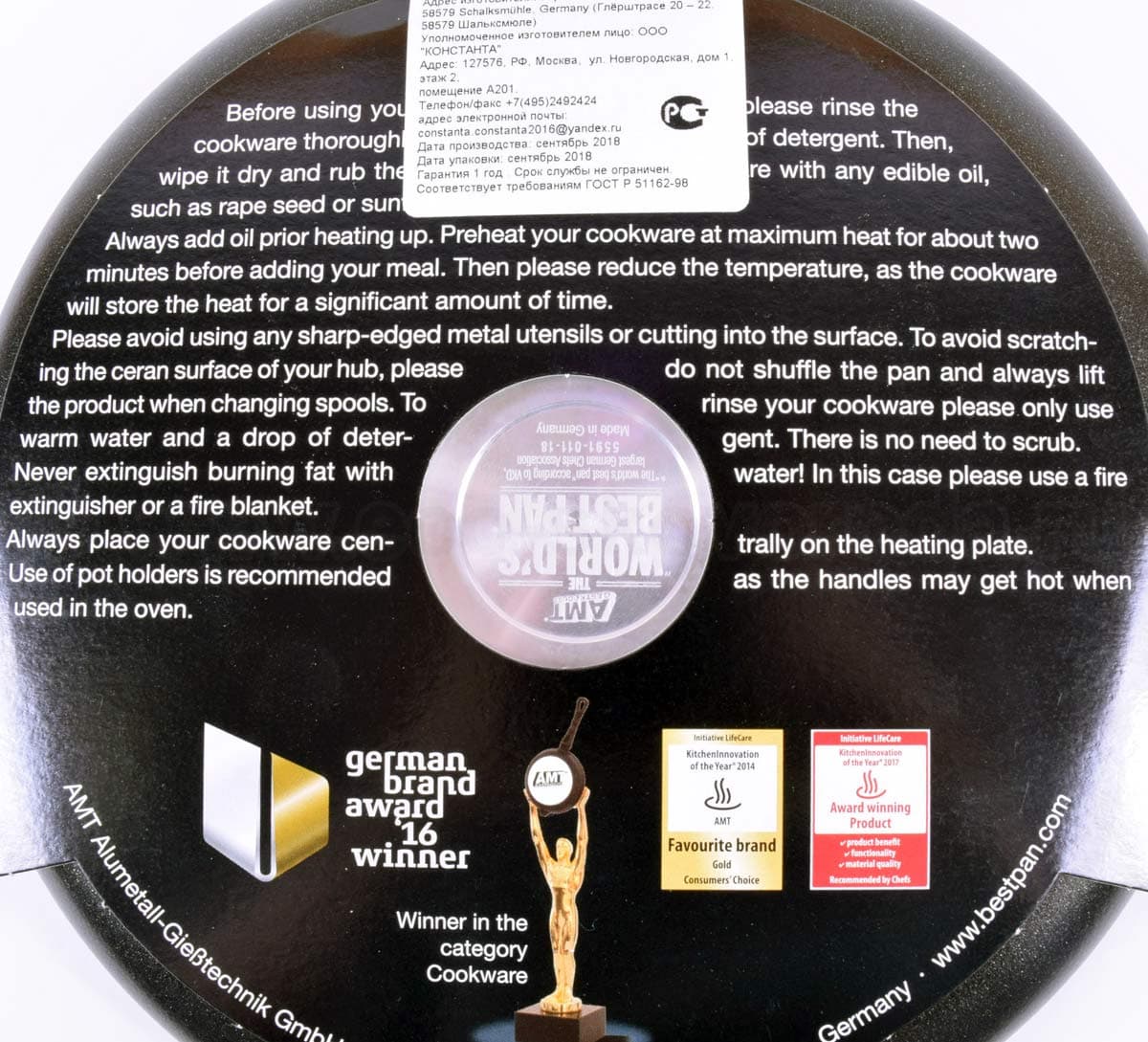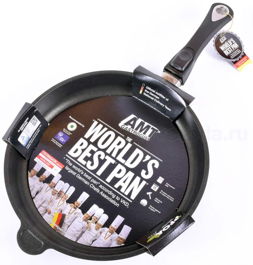 Компания AMT производит всю свою продукцию в Германии под строжайшим контролем над качеством. Каждая литая сковорода AMT GASTROGUSS отливается вручную из алюминиевого сплава высшего сорта. Запатентованный антипригарный слой LOTAN – экологически чистый, обладает антибактериальным эффектом. Шестислойное покрытие делает дно особо прочным, его невозможно деформировать даже при высоких температурах.