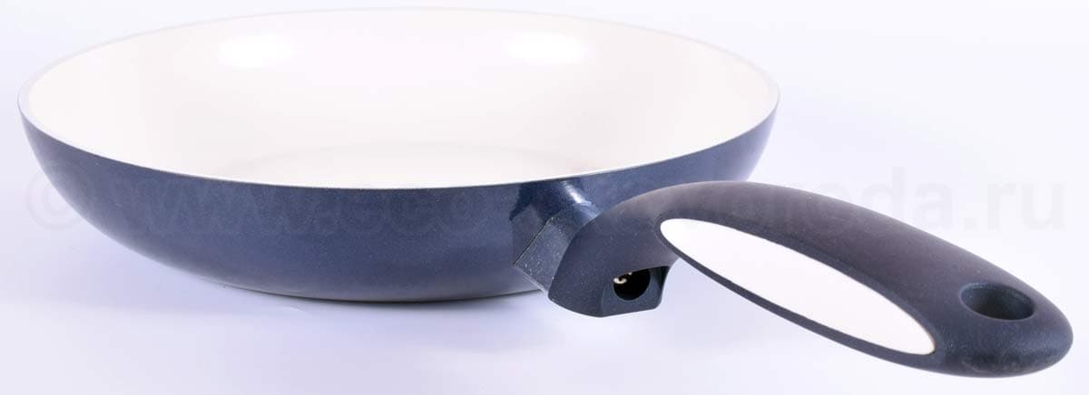 Снаружи посуда покрыта прочной синей эмалью. Внутреннее керамическое покрытие - белого цвета.