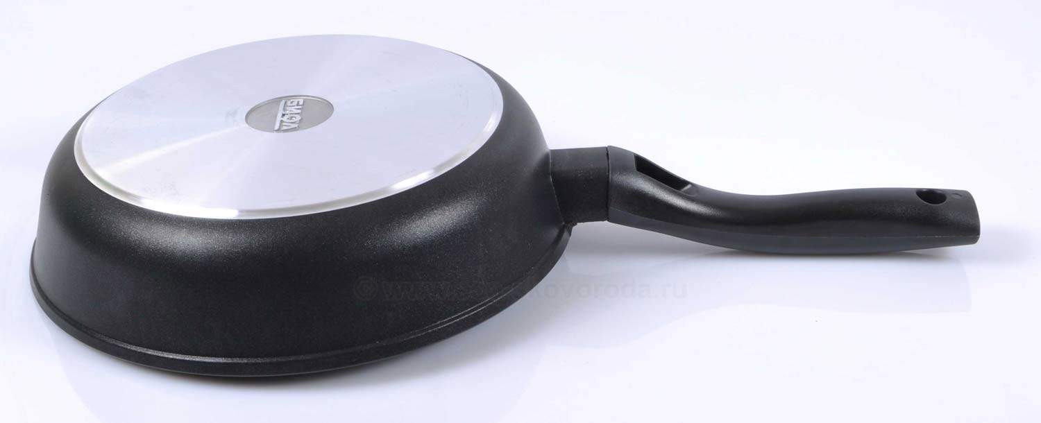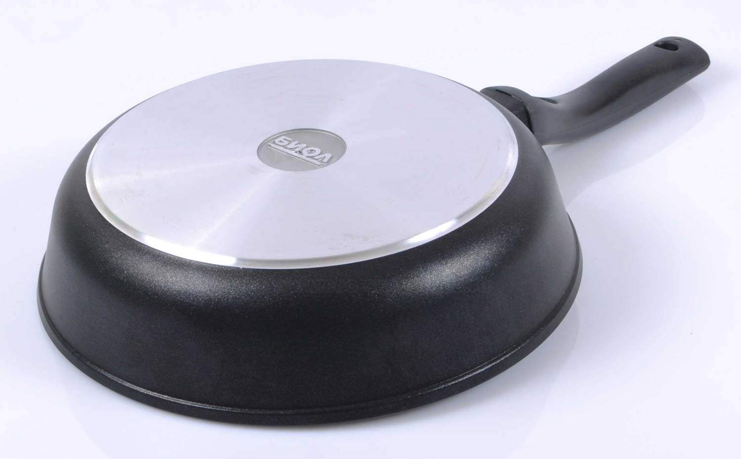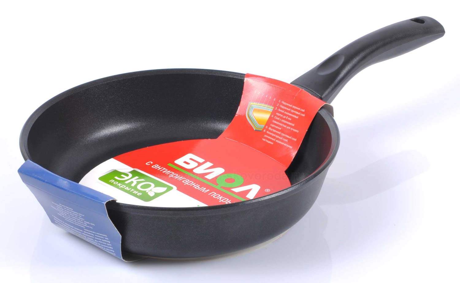 Сковороды Биол серии Классик изготовлены из пищевого сплава алюминия методом литья. Утолщенное дно (достигает 6 миллиметров) такой посуды быстро и равномерно распределяет тепло. Дно посуды проточено до зеркального блеска.