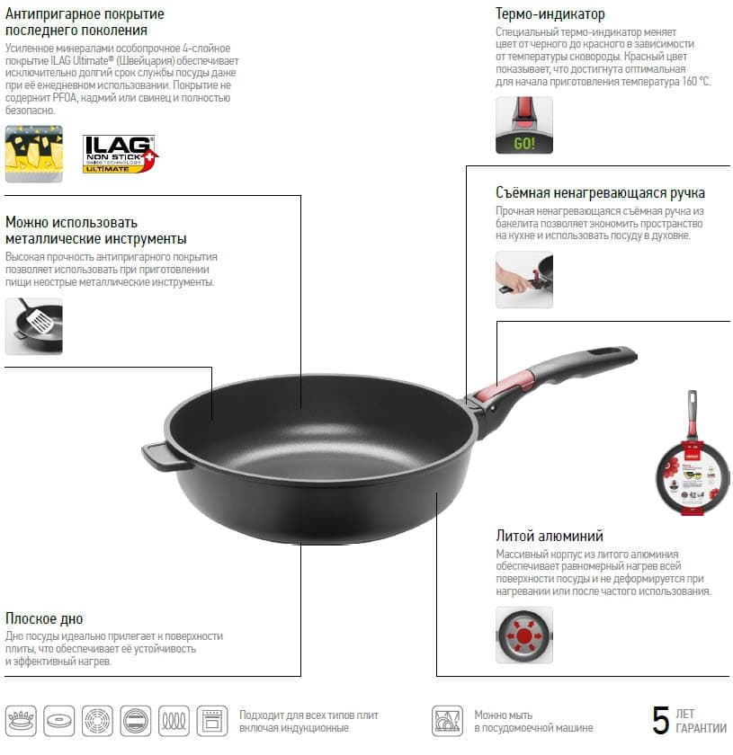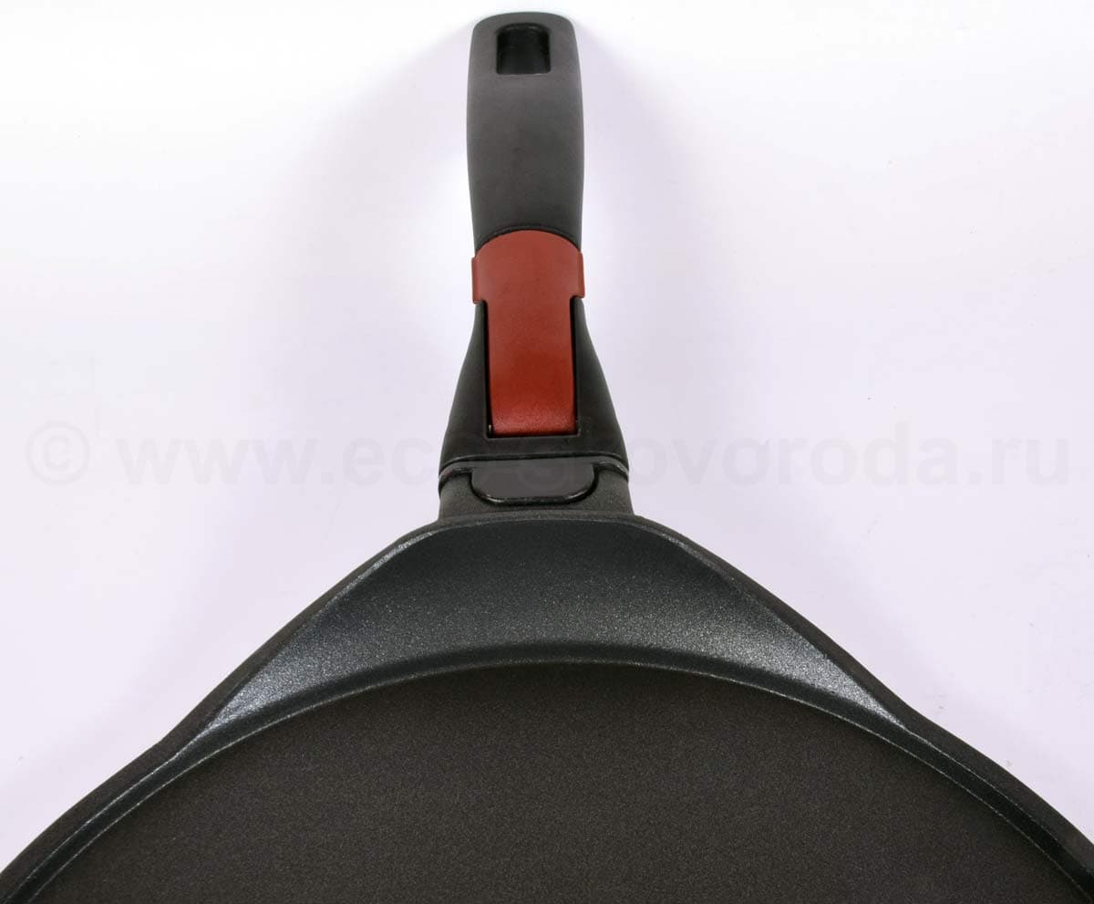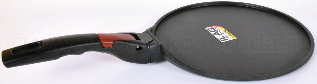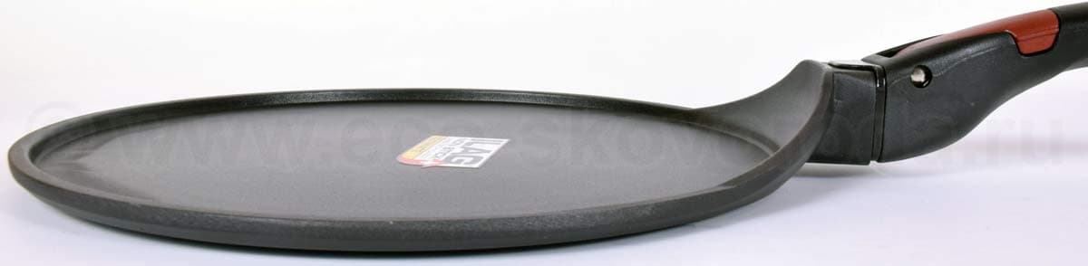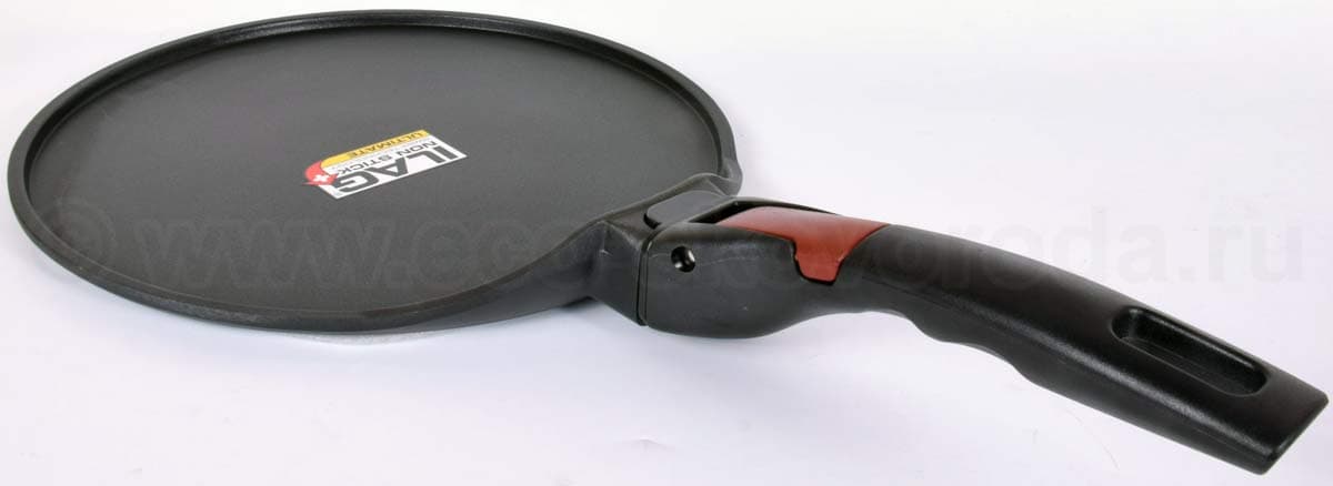 - Достоинства: Плоское дно (оказалось, что есть далеко не у всех сковородок). Снимающаяся ручка, при этом надёжно фиксирующаяся. Пища не пригорает.
