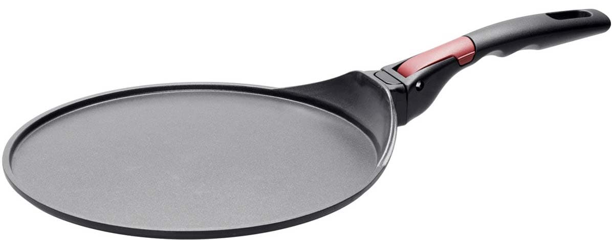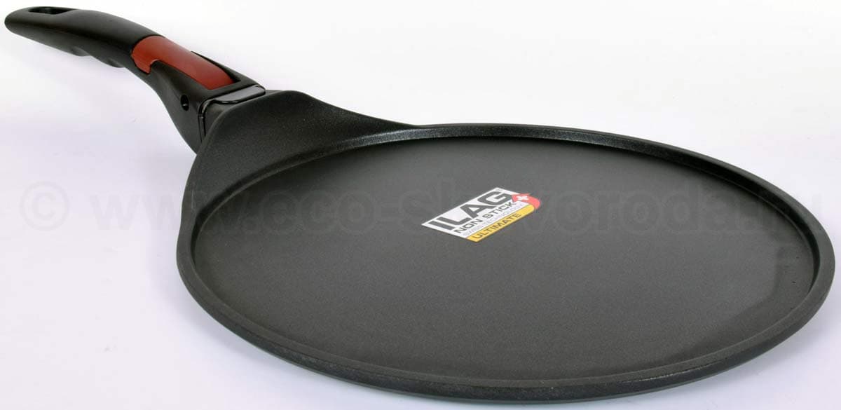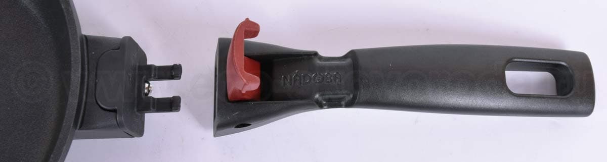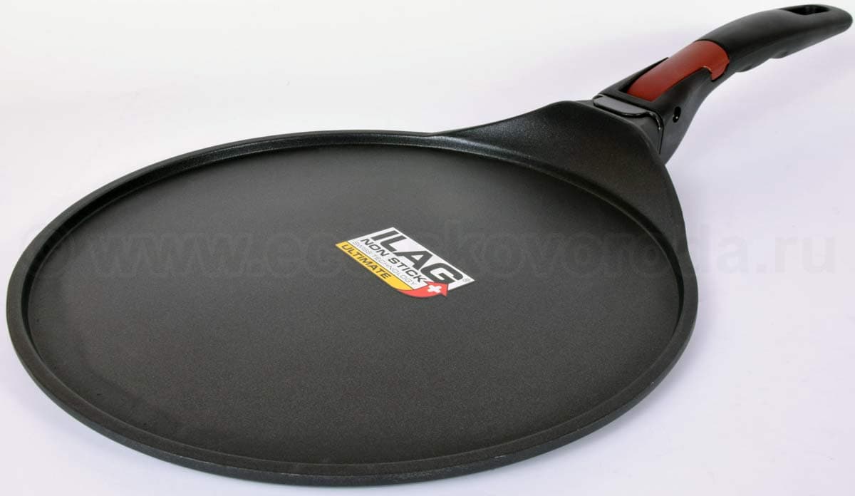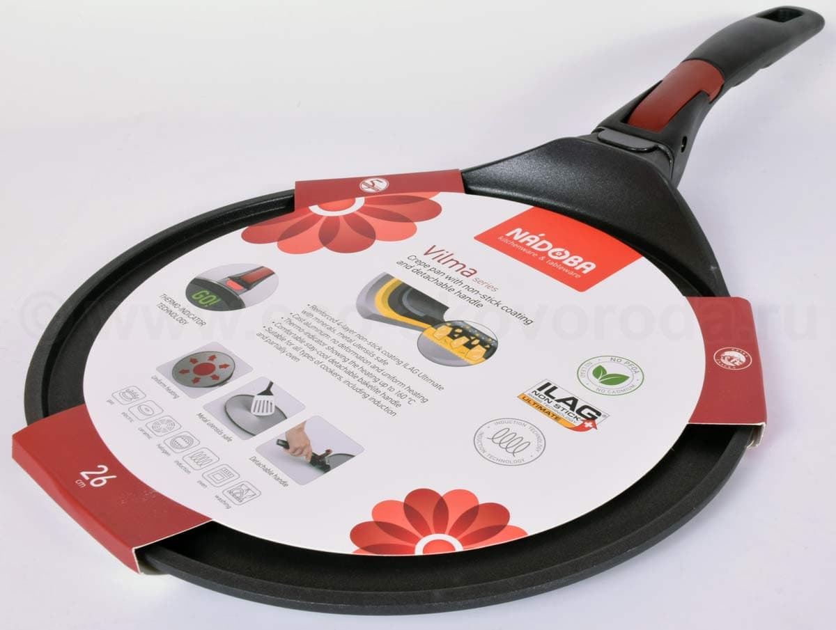 - Достоинства: Плоское дно (оказалось, что есть далеко не у всех сковородок). Снимающаяся ручка, при этом надёжно фиксирующаяся. Пища не пригорает.