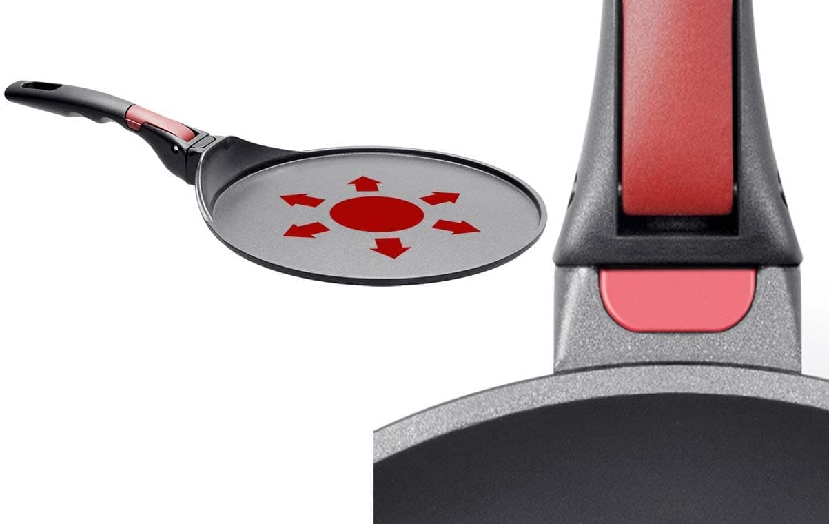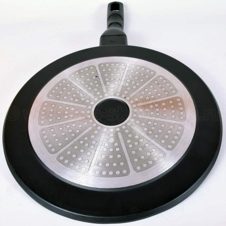 - Недостатки: В этой модели не нашёл. Придирка: термоиндикатор работал не так, как предполагает производитель. Если дожидаться, пока же он покраснеет, то сковорода излишне перегревается и масло от положенной на неё пищи резко вскипает и разбрызгивается. Так что им не пользуемся, тем более, что сейчас он уже всегда красный, даже в холодном состоянии.