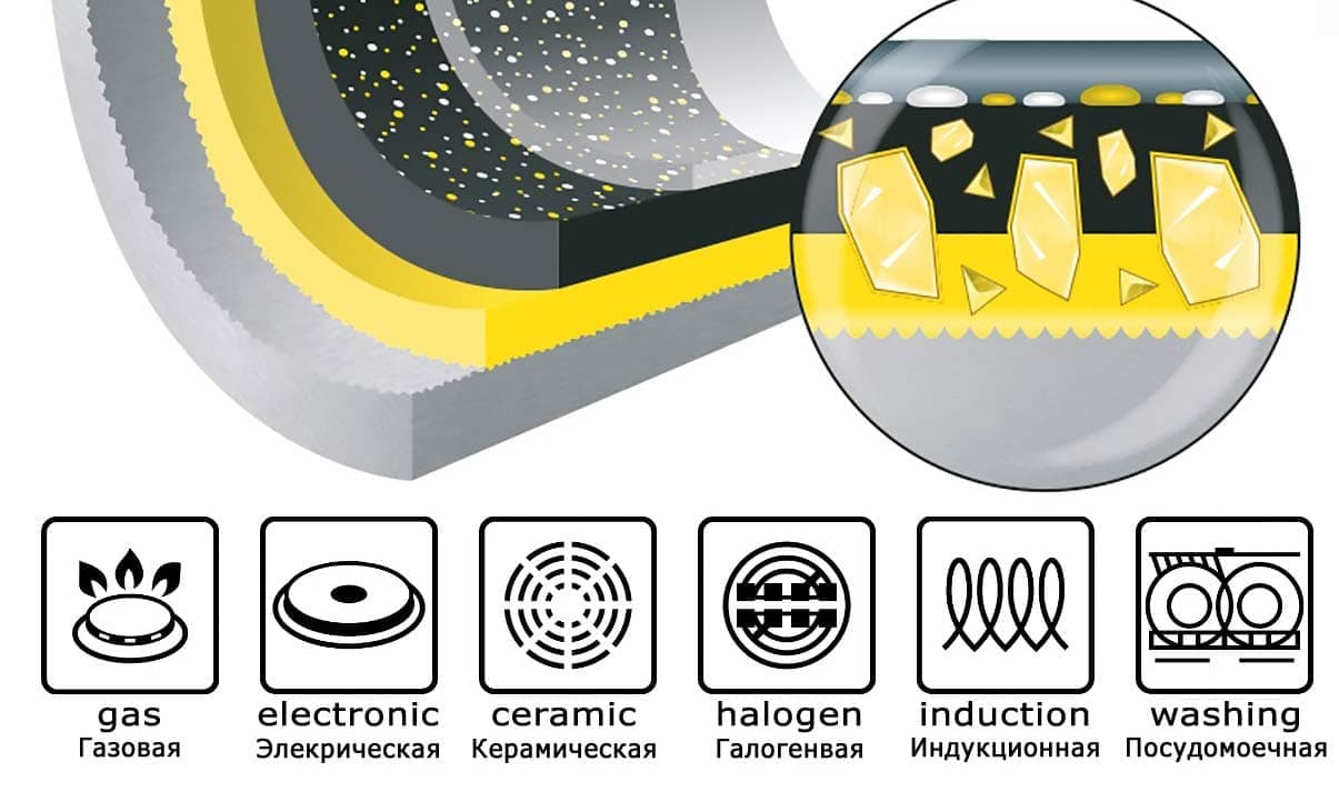 Во всех случаях это сковороды на 28см с антипригарным покрытием и съёмными ручками, чтобы можно было поставить в духовку.