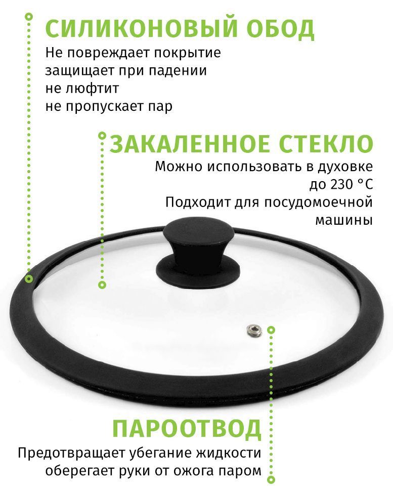 Крышка TIMA с силиконовым ободом выполнена из закалённого стекла, имеет встроенный пароотвод. По краям крышки силиконовый обод. Эргономичная, удобная ручка крышки также выполнена из силикона, за счёт чего крышку можно использовать в духовке до 230 °С. Подходят для мытья в посудомоечной машине.