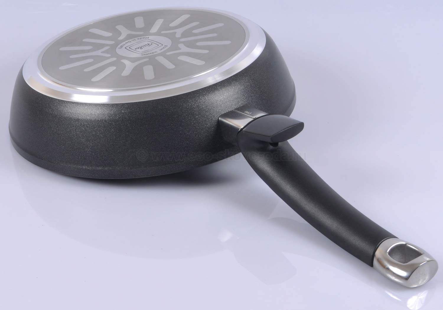 Имея 10-ти миллиметровое утолщенное дно, с углублением в виде звезды, прогрев происходит равномерно по всей площади сковороды. Благодаря этому пища будет обжариваться одинаково, не зависимо от того, где она лежит, в центре сковороды или рядом с ее бортиком.