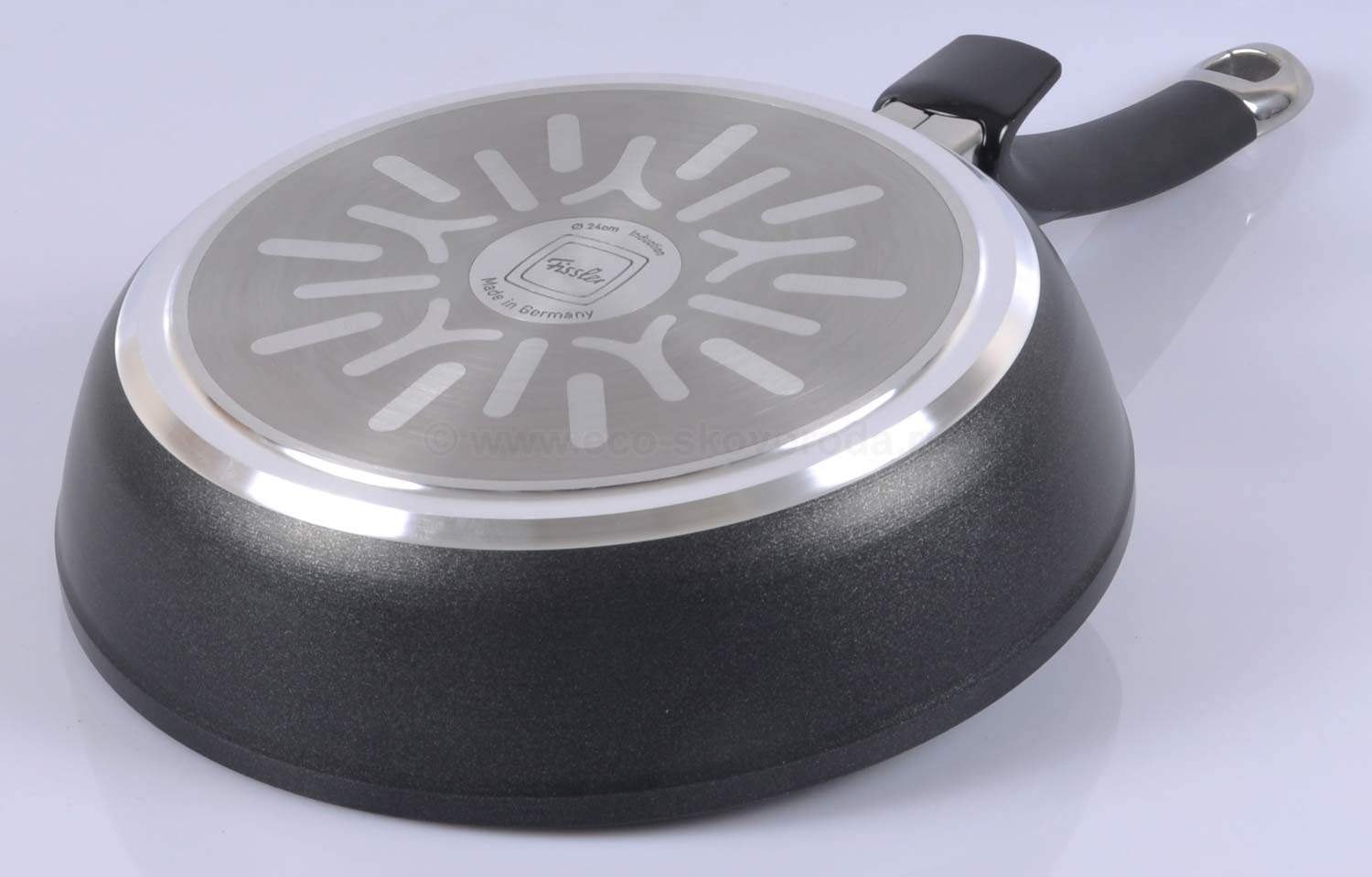 Имея 10-ти миллиметровое утолщенное дно, с углублением в виде звезды, прогрев происходит равномерно по всей площади сковороды. Благодаря этому пища будет обжариваться одинаково, не зависимо от того, где она лежит, в центре сковороды или рядом с ее бортиком.