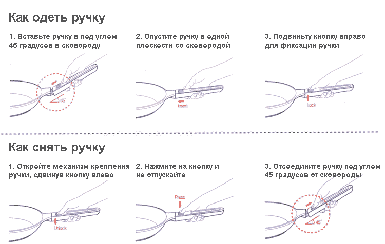 Благодаря системе съемных ручек доводить блюдо до готовности можно, переместив посуду с плиты в духовой шкаф. А также при хранении с помощью съемной ручки посуда будет занимать намного меньше места.