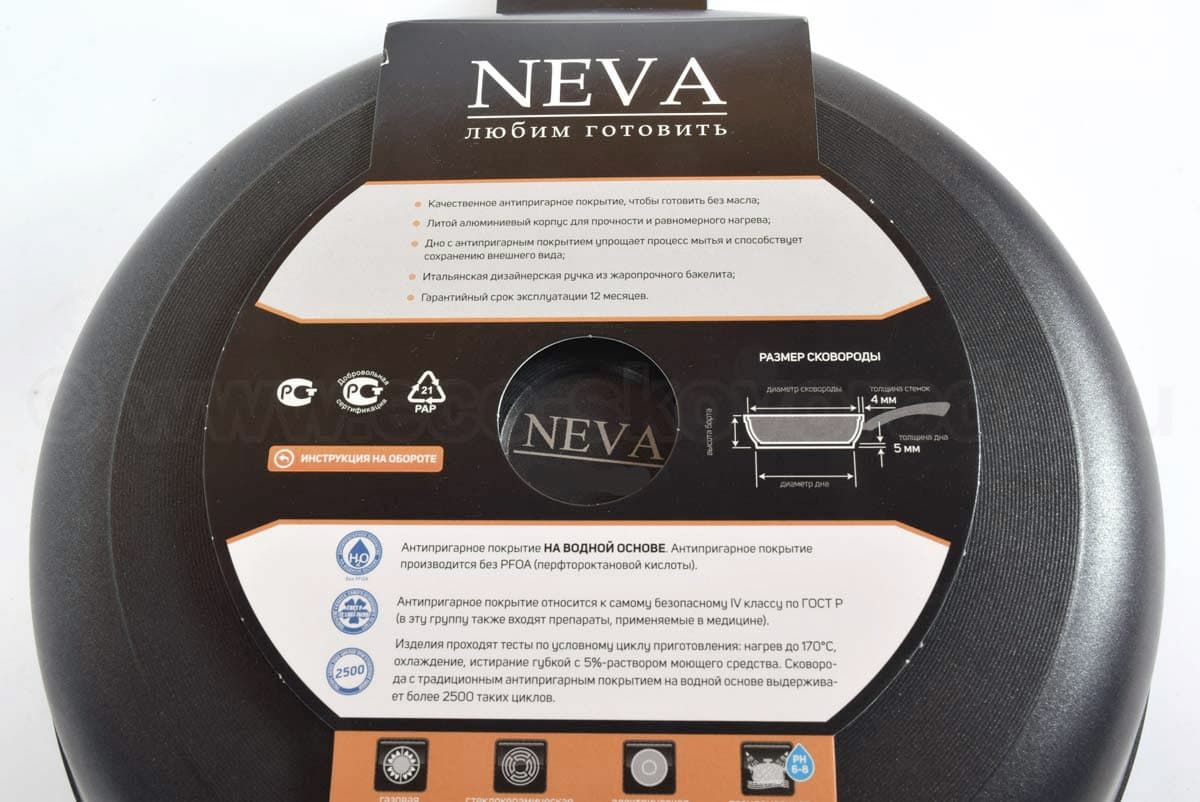Бренд NEVA является отдельным направлением компании НЕВА МЕТАЛЛ ПОСУДА. Изделия NEVA сочетают в себе высокие стандарты качества при доступных ценах и производятся на заводе в Псковской области. Данный завод является официальным заводом компании НЕВА МЕТАЛЛ ПОСУДА с 2007 года. Все сковороды бренда NEVA, также как и сковороды бренда НЕВА МЕТАЛЛ ПОСУДА, вне зависимости от места производства, имеют серийный номер на дне изделия. По нему Вы можете проверить дату производства, вид покрытия и другую полезную информацию по телефону горячей линии (указан на упаковке изделия).