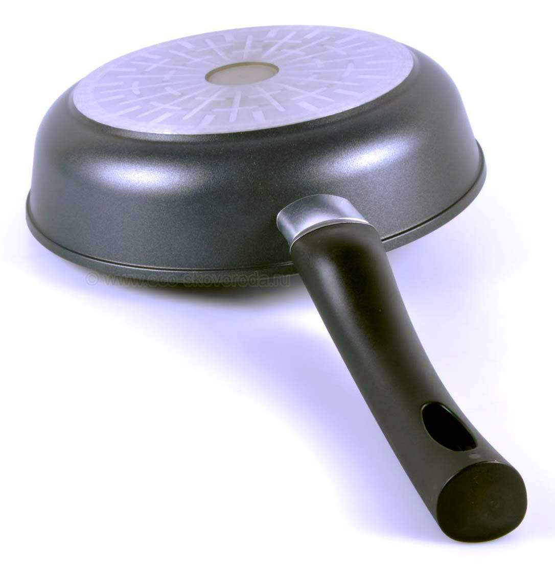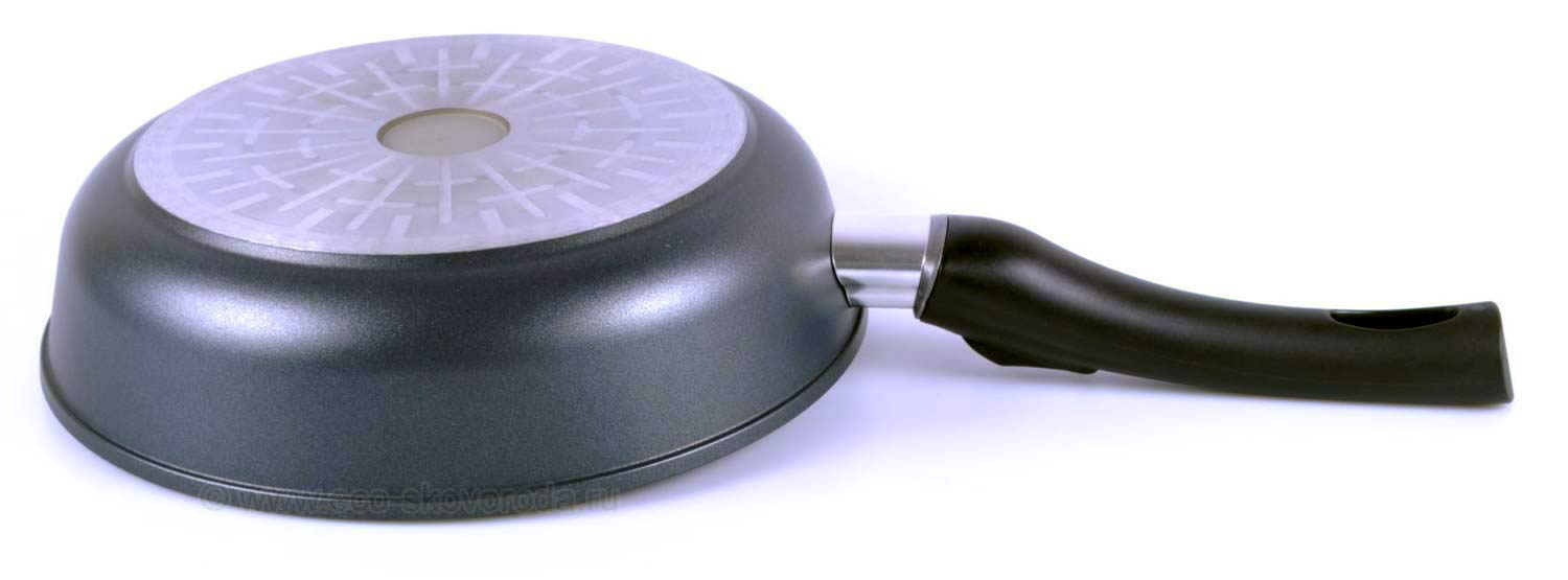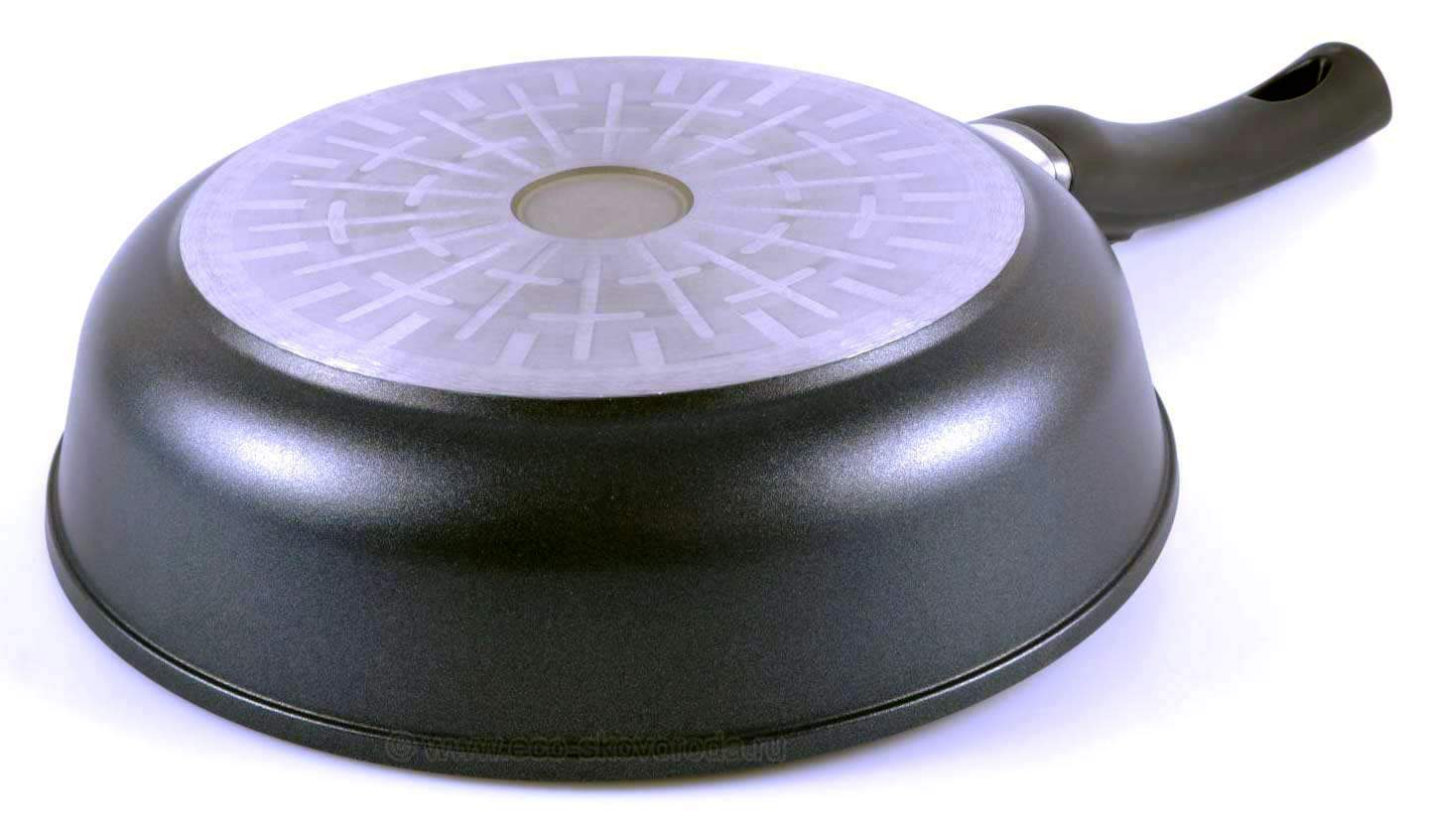 - Идеальный контакт сковороды с плитой обеспечивает гладко проточенное дно. Это способствует экономии электроэнергии, исключает появление потертостей и царапин на варочной поверхности;