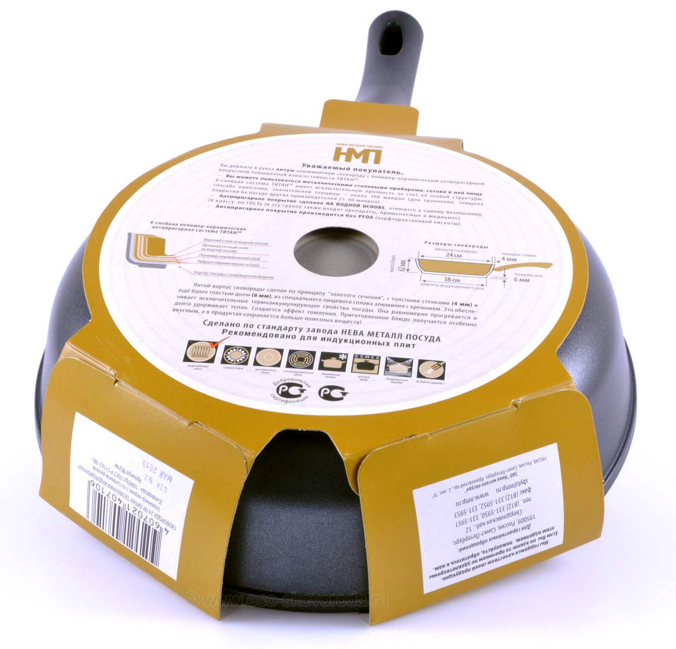 - Пятислойное покрытие на водной основе изготовлено без использования PFOA и имеет самый безопасный класс по ГОСТ.