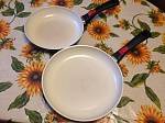 Внешний вид посуды выдержан в классических формах. Внутри керамическое покрытие цвета слоновой кости. Внешнее покрытие матово-черного цвета. Толщина сковородок и сотейников по 6-7мм. Высота борта у сковородок по 4,5-5см, высота борта у сотейников 6,5см. Ручки сделаны из черного пластика, удобно сидят в руке.