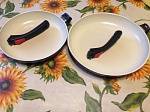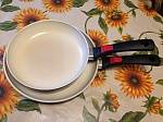 Внешний вид посуды выдержан в классических формах. Внутри керамическое покрытие цвета слоновой кости. Внешнее покрытие матово-черного цвета. Толщина сковородок и сотейников по 6-7мм. Высота борта у сковородок по 4,5-5см, высота борта у сотейников 6,5см. Ручки сделаны из черного пластика, удобно сидят в руке.