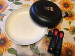 Коллекция TVS Ceramic Granit представлена в двух видах: со съемной ручкой и обычной. Коллекция со съемной ручкой не подходит для использования в духовой печи, т.к. на сковороде имеется пластиковое основание для прикрепления ручки.