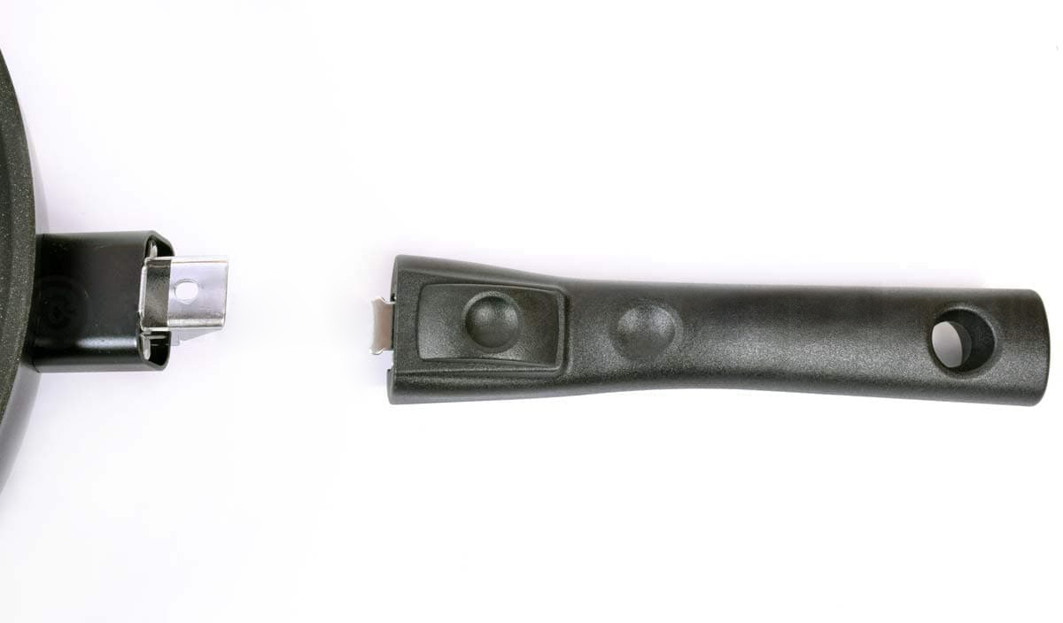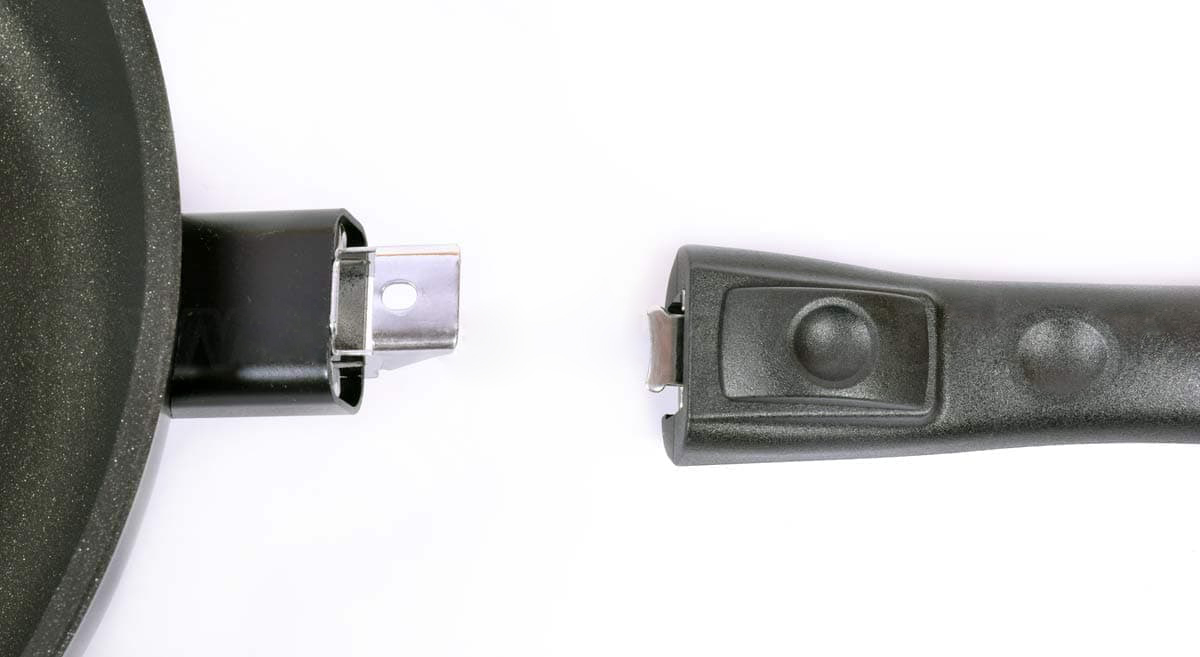Кроме того, механизм снятия и одевания ручки крайне удобный и продуманный. Снять и одеть ручку можно всего одной рукой, буквально одним пальцем, не прикасаясь голыми руками к самой сковороде. Это удобно, когда посуда горячая или на плите.