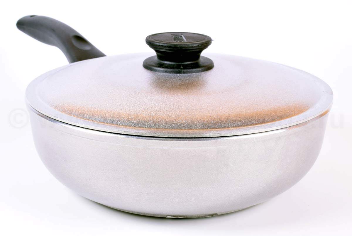 Если стенки алюминиевой посуды потемнели, налет можно удалить ваткой или тряпочкой, смоченной раствором столового уксуса пополам с водой. После этого надо промыть посуду теплой водой и протереть насухо.