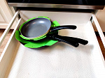 Съемная ручка позволяет экономить место при хранении, размещать посуду в углу шкафа, холодильнике или даже в самых маленьких посудомоечных машинах (должна быть спец. маркировка!).